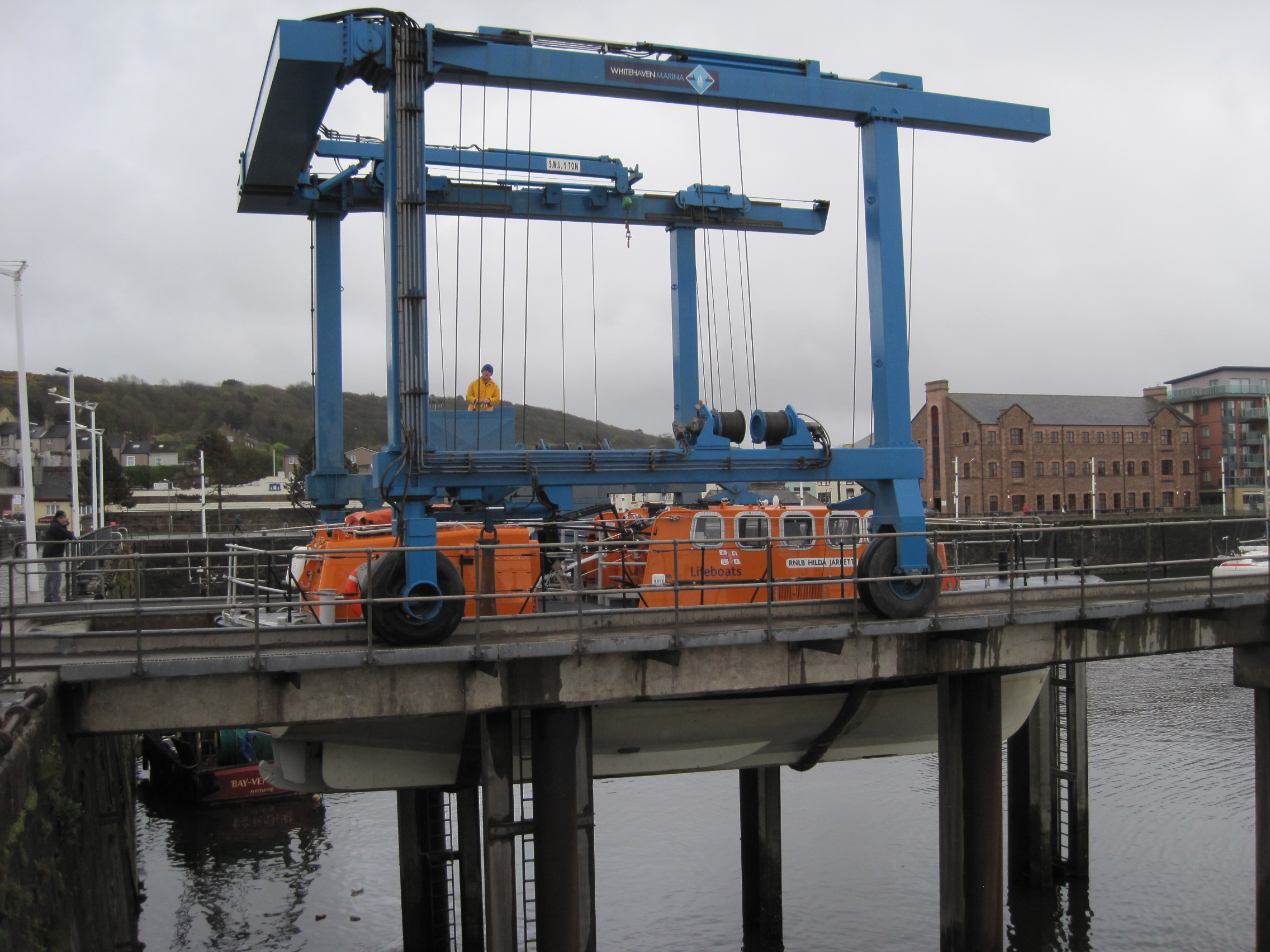 The man with the camera seemed to know a bit about lifeboats. We were standing on the dock at Whitehaven harbour, watching as a lifeboat was hoisted out of the water. I hadn’t known that was due to happen: I’d seen the lifeboat moored down below the harbour wall earlier, and now as I walked back that way it was rising up into view.