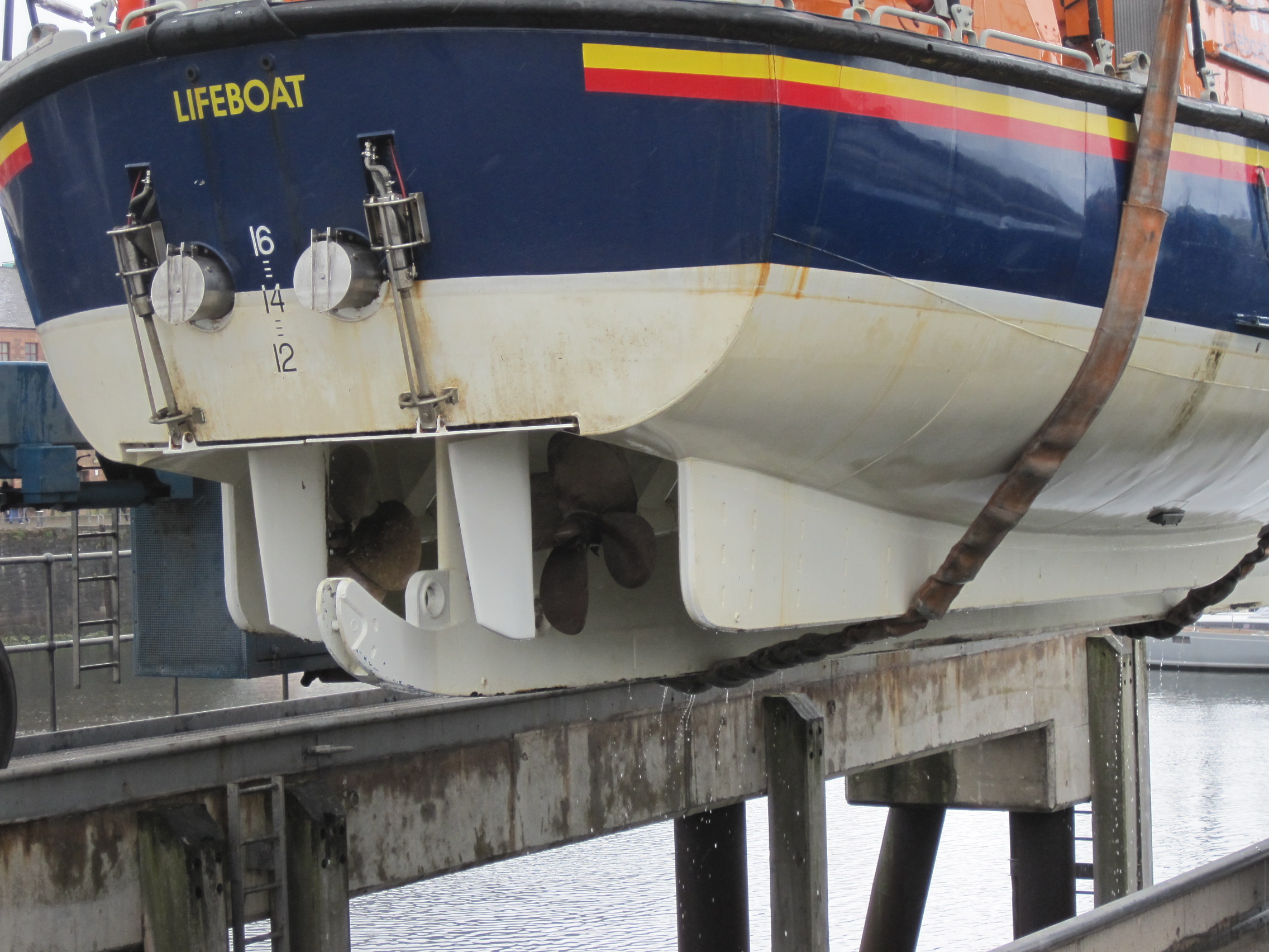 “You see she’s got a white bottom – that shows she’s a general-purpose boat. She can be housed on a cradle, go down a slip, or stay afloat.” Red-bottomed lifeboats are moored afloat all the time.