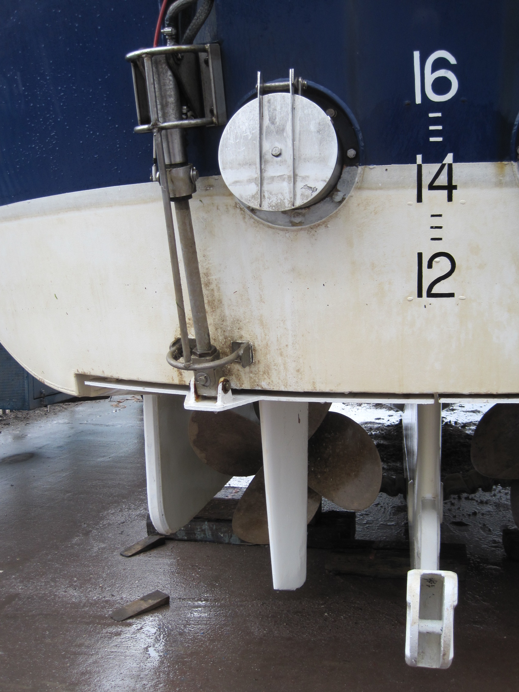 He took me round to the stern and we looked at the propellors (which had a few white limey tubes of the marine worm Serpula on them, but were otherwise clean) and saw how they were protected by the structure of the hull, so as not to get damaged on a slipway. And there were two circular hatches, way underneath, which can be opened to allow for cleaning weed from the propellors. “You can do it from inside, you hang down into the tube – it’s a good way of getting seasick!”