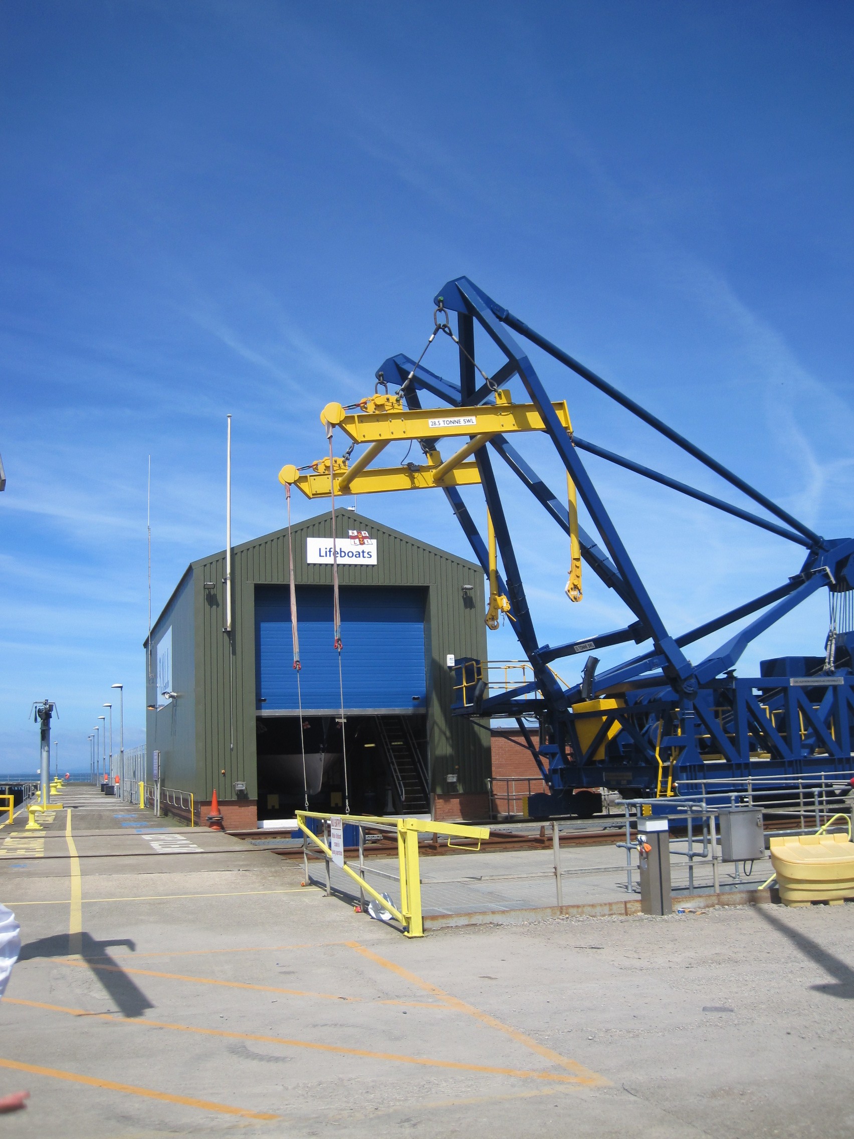 Workington RNLI’s general-purpose lifeboat is another Tyne-class boat, 47-028, the Sir John Fisher; the Facebook page notes that “it is the only davit launched alb [all-weather lifeboat] owned by the RNLI.” I remembered looking into its boat-house when I was at the Port of Workington.