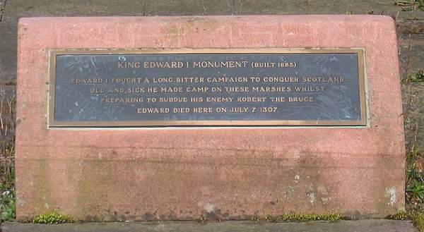 In 1307 Edward I was again sending troops to wage war against the Scots; despite growing ever weaker from dysentery, he insisted on being carried across the Solway as an example to his troops. “Daybreak on 7th July, 1307, found him in camp on the shore north of Burgh by Sands. The road for Scotland lay in front across the fords – the Stonywath, hard by, over the Eden; and the Sulwath, two miles distant, over the Esk. As his attendants were in the act of raising him to give him food he collapsed in their hands, and the mighty spirit passed away.” (Neilson 1896).