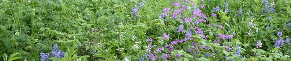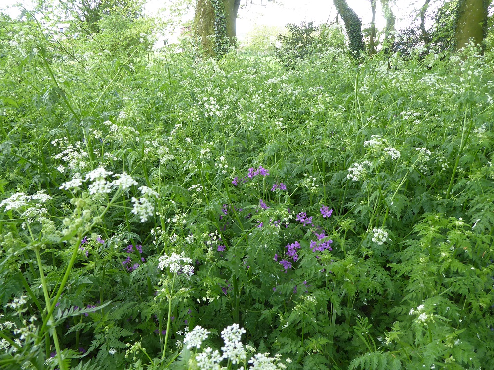 I managed to persuade my husband that the grass in the wooded areas doesn’t need to be cut like a lawn! At the moment the floor of the old wood is a white froth of cow-parsley, mixed with the deep purple of self-seeded Honesty and a jumble of pink- and white- and blue-bells, all of which are now the ‘Spanish’ type (although I’m sure they were ‘English’ when we first moved in). This has been a good year for celandine and dandelions – and also for cuckoo-pint, whose pale sheaths and glossy leaves have proliferated in every shady patch. Earlier, there was a carpet of snowdrops, followed by daffs – both species seem to proliferate naturally as well as with some help from us (splitting and re-planting clumps when they’re ‘in the green’).
