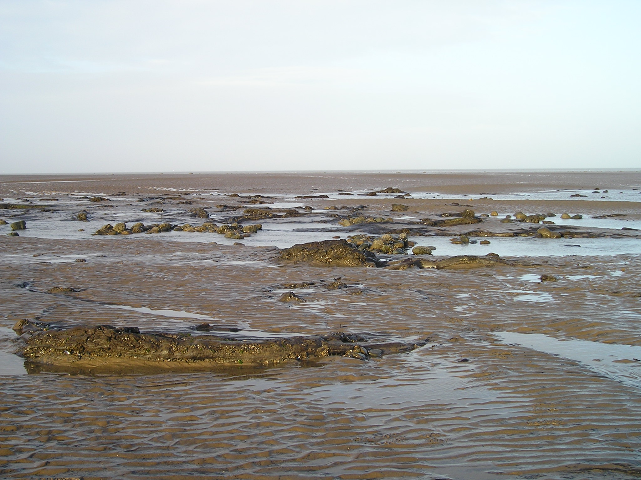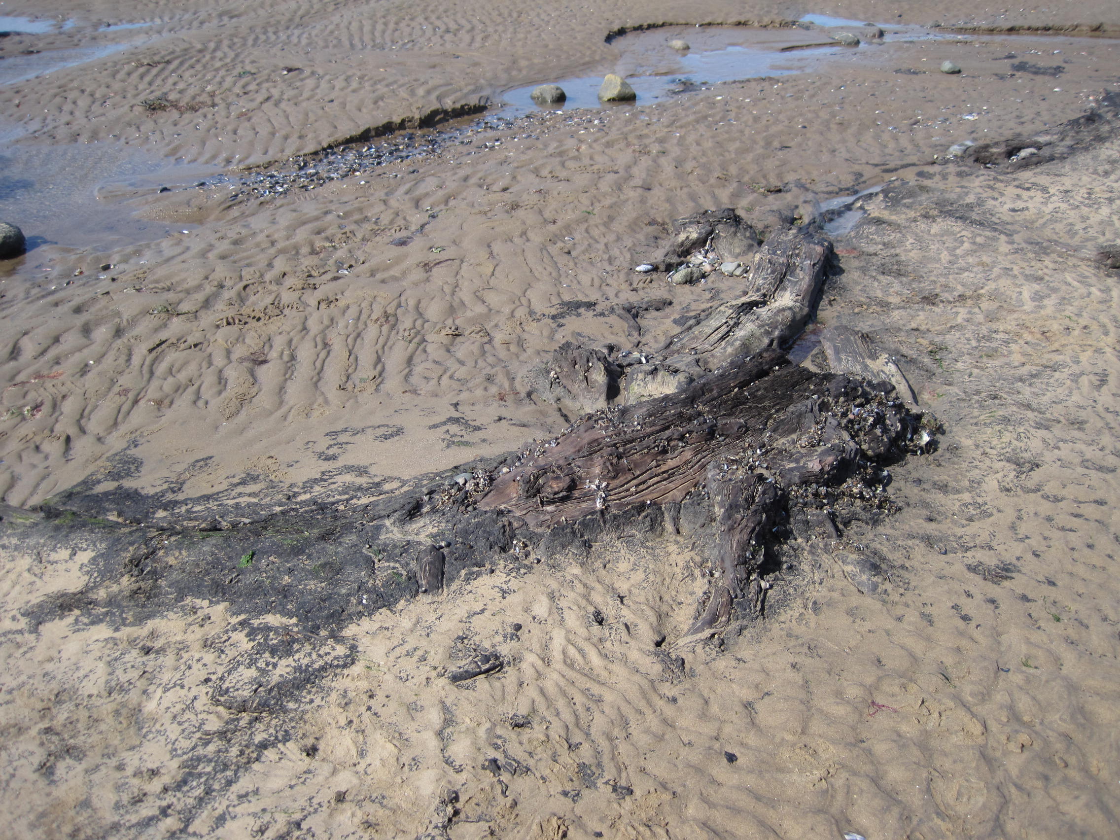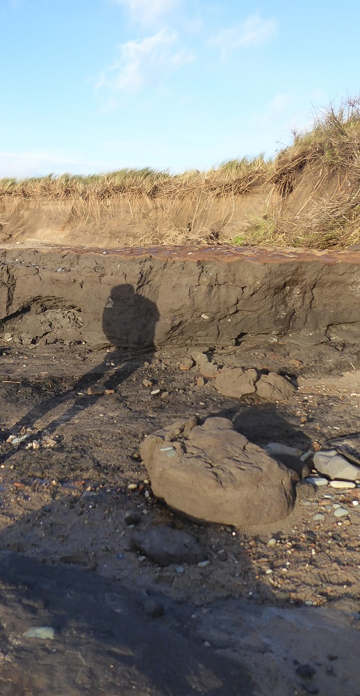 “the patches of black are like shadows along the sharp edges of channels in the sand. Walk down towards them, and the shadows resolve themselves into banks of peat. Poke them with your toe and feel how dense and sodden they are, smoothed by the friction of waves and sand. Walk on them and feel their sponginess. And gradually you will become aware that the dark organic mass is not only peat, but supports here a horizontal tree-trunk, or there a stump that radiates roots. Wander around and you will find trunks and branches, single and entangled, embedded in the peat and sand; and erect stumps, 20-30 cms high, their tops flattened as though cut by a chainsaw. The wood is still fibrous, soft and dark; you can crumble it and tease it apart, as though it were any rotting log in a woodland. But the difference is that this woodland thrived about 8000 years ago.”