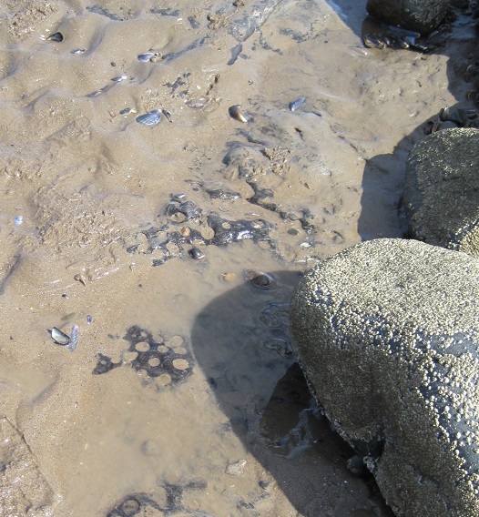 Piddocks are extraordinary: these bivalve molluscs (think of them as much fancier relatives of mussels) normally live, protected, inside rock below low-tide level. The animal’s shells are intricately patterned with sharp, toothed ridges and, by extending and retracting its muscular foot, and shoogling its file-like shells, the piddock gradually bores in, living within the burrow, enlarging the diameter – but not the entrance – as it grows, feeding on particulate matter in the sea-water. Burrowing would be laborious, unless the larval piddock finds and colonises a bank of peat that has been uncovered by the sea. Twice I have been excited to find peat that has been riddled with piddock burrows – one time the white shells of the long-dead animals were still trapped inside. That newly-revealed peat contains piddocks and their wide-diameter burrows, shows that this is not the first time it has been uncovered: it must have been exposed to the sea at a subtidal level for at least several years before it was buried again beneath the sand.