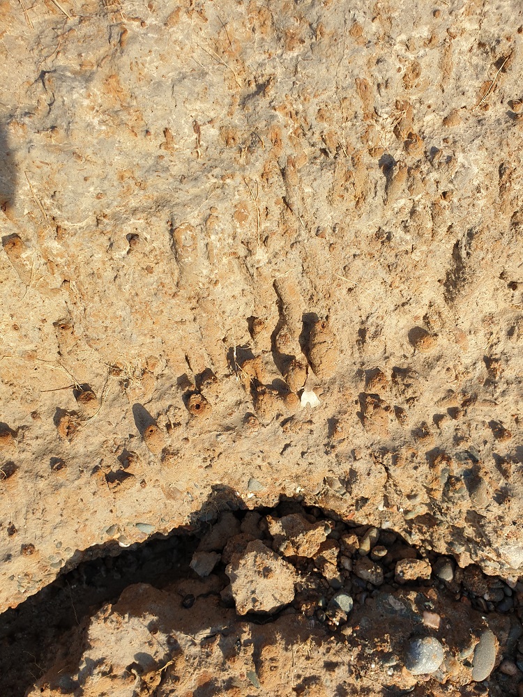 Intriguingly, the surface of the clay was pock-marked with tiny holes, the entrances to burrows. I broke off a piece and found the burrows had been filled in with yellowish sand.