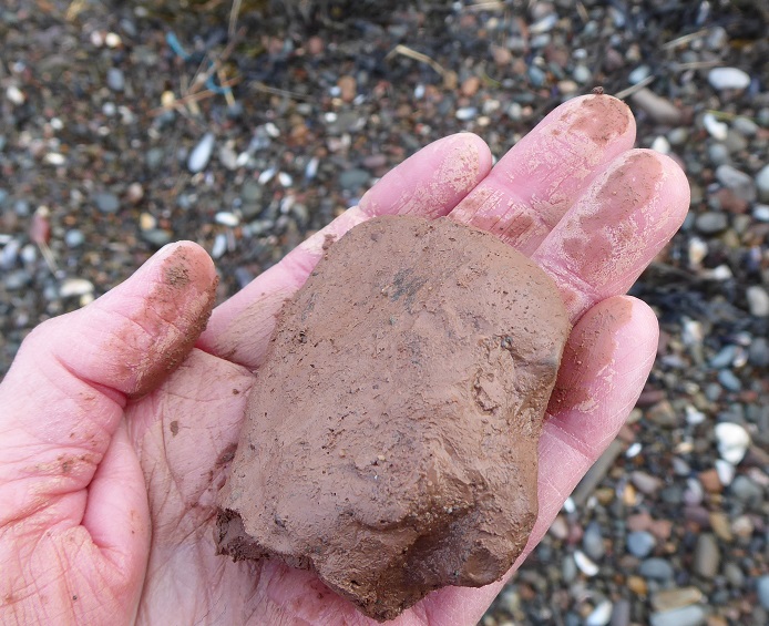 However, the layer of red clay was still visible further to the North. It occurs at various places between Allonby and Beckfoot, and is coarser and more granular than the grey boulder clay. It would be possible to roll it into a ball, and press a stick through it to make a hole, smoothing the edges with your thumb. You could make a loom-stone or a fishing-weight, similar to those that I and others have found along the shore.