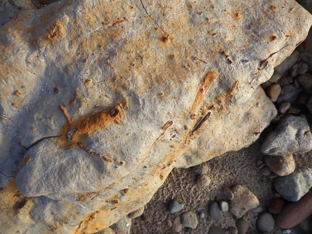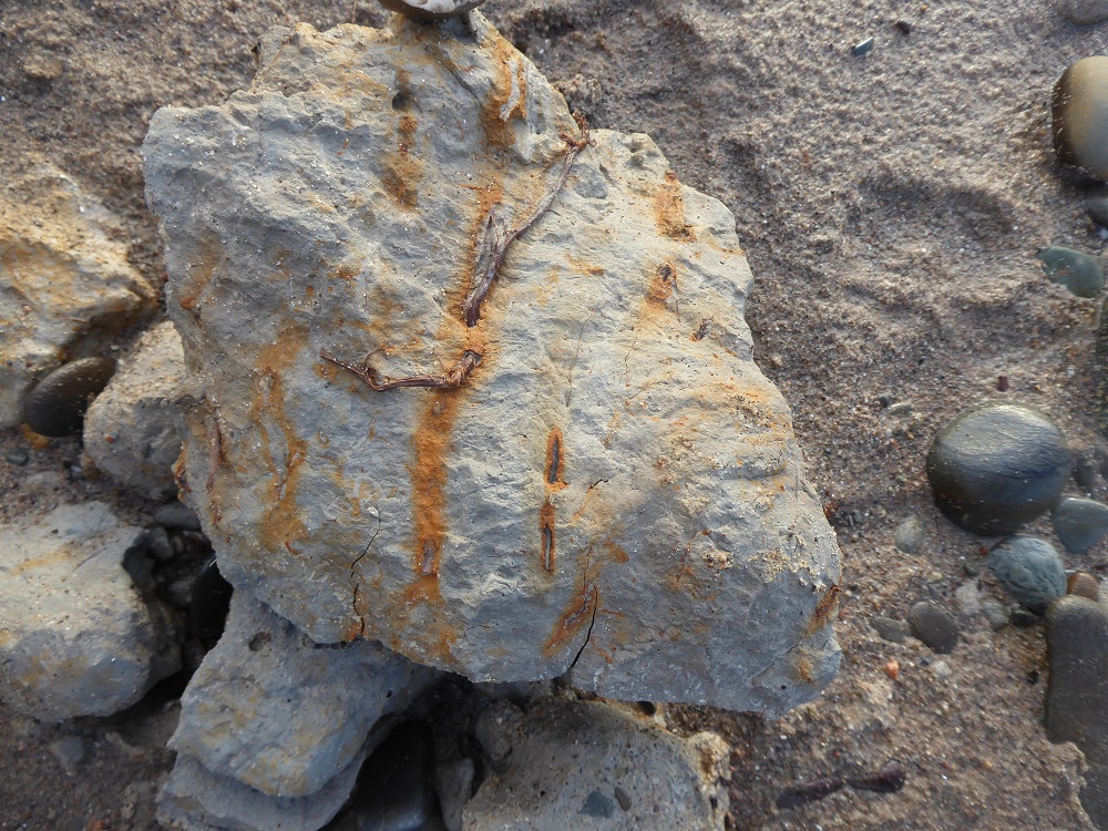 The patterns of newly-exposed clay and peat at Allonby suggest this might have been a soggy area like the lagg fen that circumscribes a bog, where trees find it hard to grow; after the sea-level rose and the fen was inundated, the hollow trapped water-borne detritus; sometimes sand was deposited on top of the peat; a ray’s egg-case was caught in a crack and later buried. Later, when the peat and clay were higher and drier, fresh water seeped down through the peat and onto the clay, carrying red iron salts that accumulated in holes and hollows. And here at Allonby these colourful ferric salts accentuate another puzzle: tubes with hard, ochreous-red walls projecting upwards from the clay.