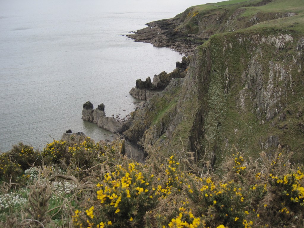 The rock hereabouts and on much of the coast west of Kirkcudbright is a “greywacke” sandstone. This tends to be brittle and so needs careful handling. However, winter storms often clear the cliffs, or at least the lower sections, of loose rock so there are not too many unstable blocks and few rubble-strewn ledges. (An exception is the crag at Burrow Head which is pretty unstable).