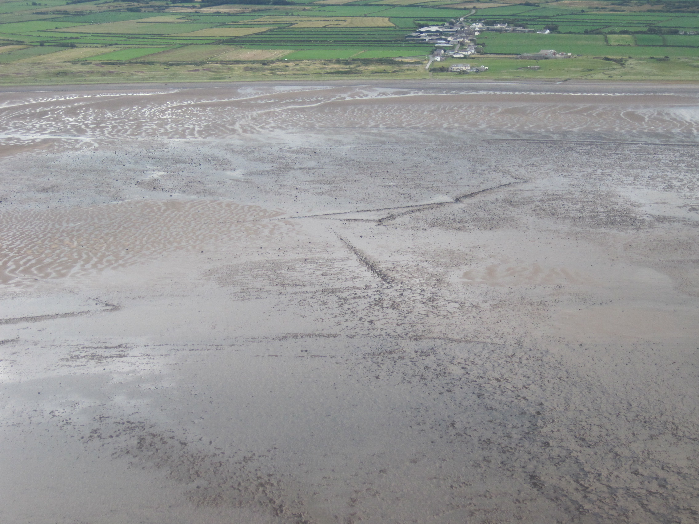 And so this led to my gyroplane flight [1], to understand the relationship of the stone shapes to the shore itself and to the longshore drift and line of the ebbing tide. From above I marvel at the straight dark lines, as though the marks have been stippled with a crumbling stick of charcoal upon the smeared brush-strokes of the pebbly scaurs. And now it seems obvious that the corners had been built to trap the ebbing tide, to capture fish as they attempt to follow the falling sea. Perhaps the long lines of stones served like low dams to guide the outflowing water into the traps? These structures were surely built by people who understood the often complex movements of water on the shore, where the tides and currents were influenced not just by the Moon but by the weather and the rainfall, influencing the rivers and becks that flow into the giant estuary that is the Solway Firth.
