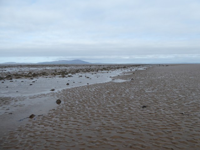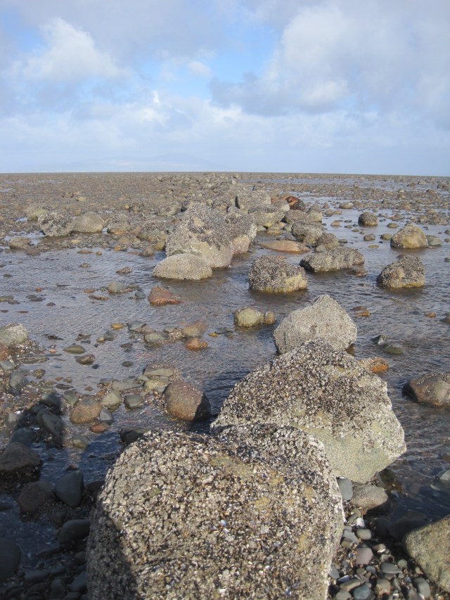 The tide was very low, the water long drained from the middle shore, but several of the shapes were still retaining shallow pools of water. I paced one long straight row and it was nearly 200 metres long. Much further down the shore, I could just pick out more dark lines and telltale glimmers of caught water. Different rows might have led the water into traps, or been built by different fisher families.