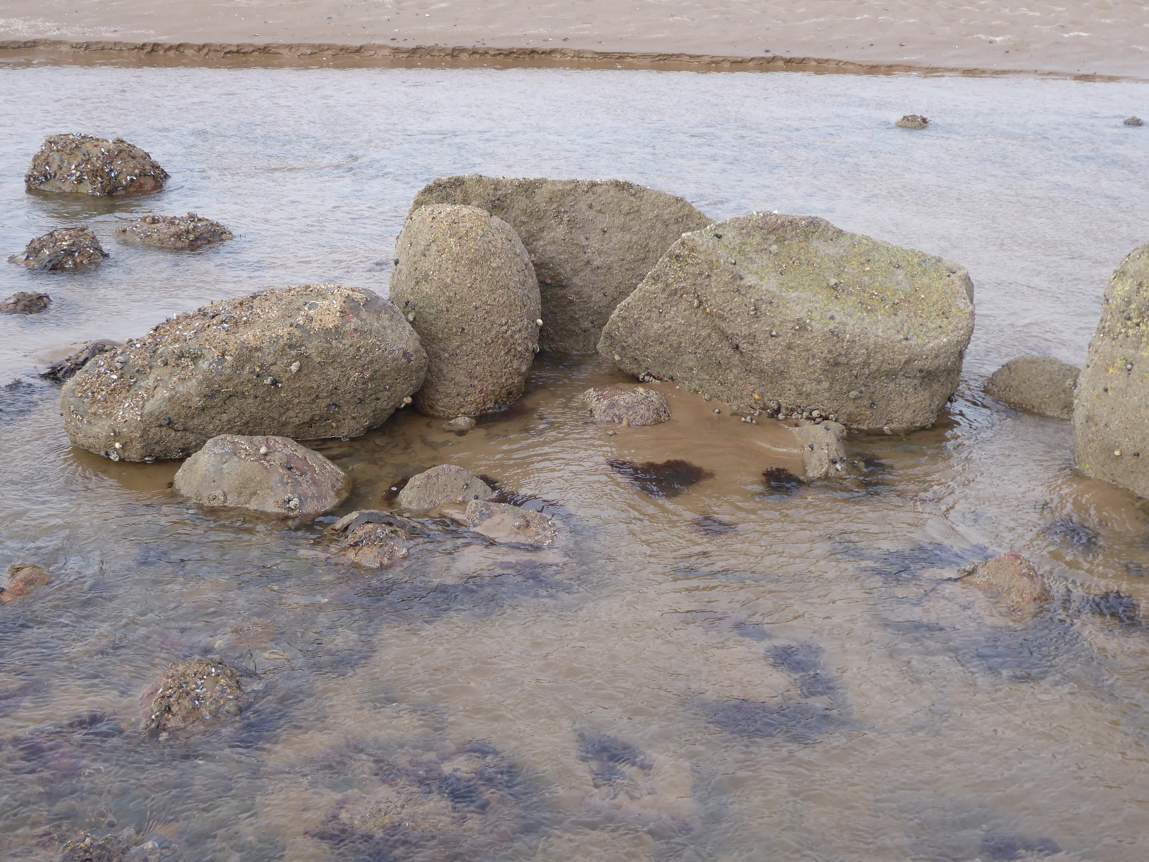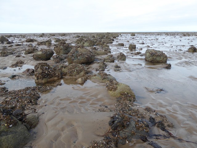 So, in March 2014 I took the photos with me for orientation and searched the mid-to-lower shore for the geometrical shapes. As I noted then, “it was a bright morning, but the wind was eye-wateringly cold. The shore has been re-modelled by the January storms so that comforting landmarks are no longer there; sand, that once hid much of the rocky, pebbly mid-shore, has been sluiced away and moulded into domes and hollows. Stones, each formerly a little ecosystem of adherent organisms and weed, are bright with the tatters of mussel-shells and broken barnacles.”