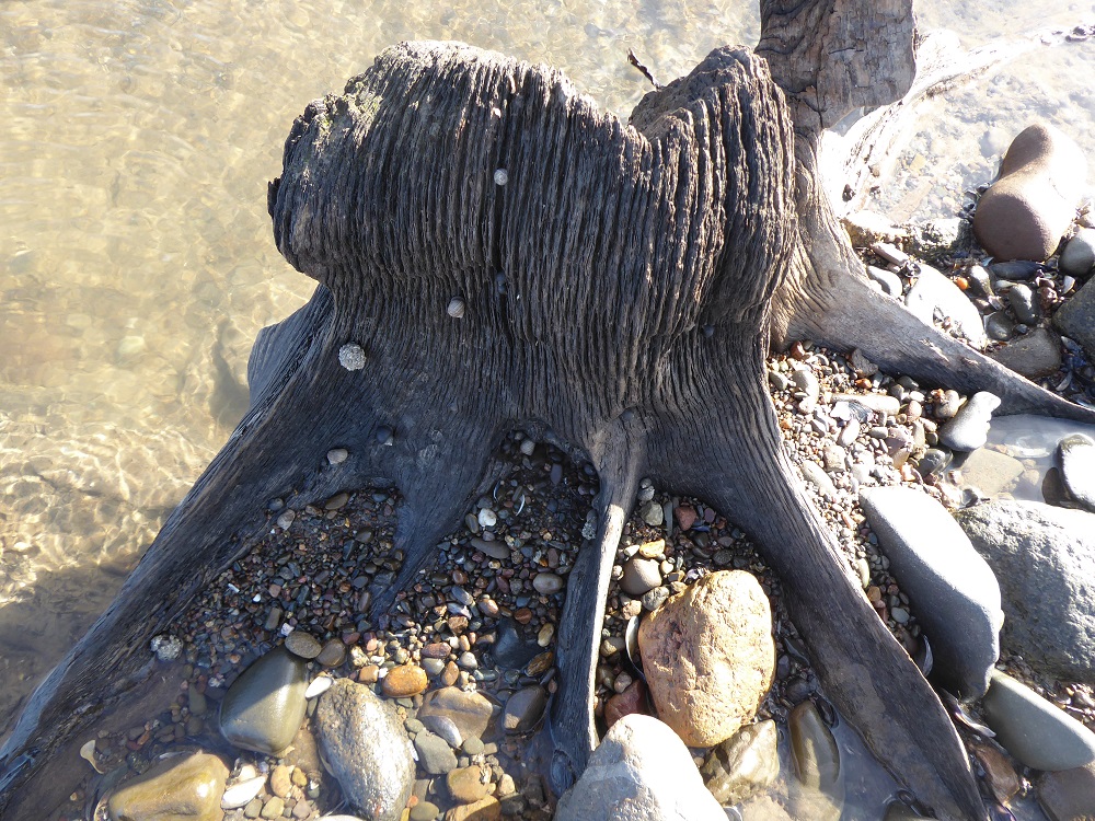 Towards the bottom of the shore a patch of darkness covers the sand and I head straight down towards it; across wave-smoothed sand that is stippled with the coils and holes of lugworm burrows; splashing through shallow pools; crossing pebbly scaurs deposited by glaciers and now slippery with weed … and the darkness is as I had hoped, a bank of peat and embedded roots and fallen trunks of trees. The submerged forest, re-emerged from its burial by sand and shingle.