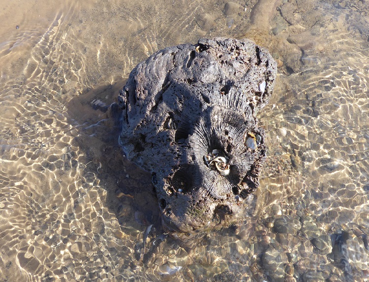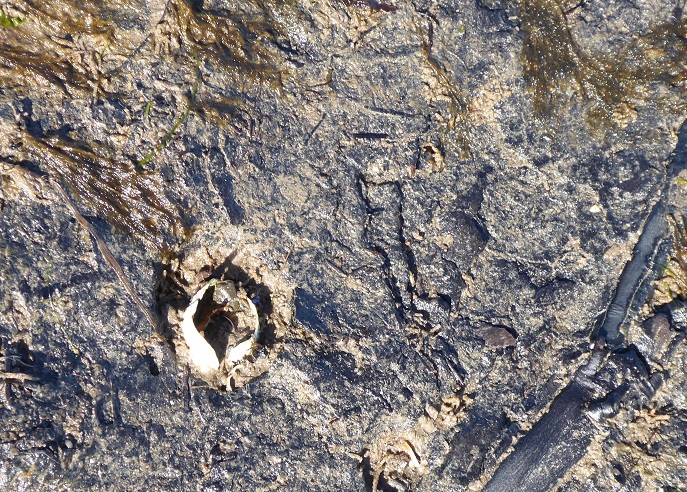 Piddocks are normally found at or below the lowest intertidal level, down to about 35 metres. According to the MarLIN website their burrows have been found in ‘a wide range of substrata including various soft rocks such as chalk and sandstone, clay, peat and very occasionally in waterlogged wood.’ And here they are, in the peat, the tips of their empty shells still visible within the sediment-filled burrows.
