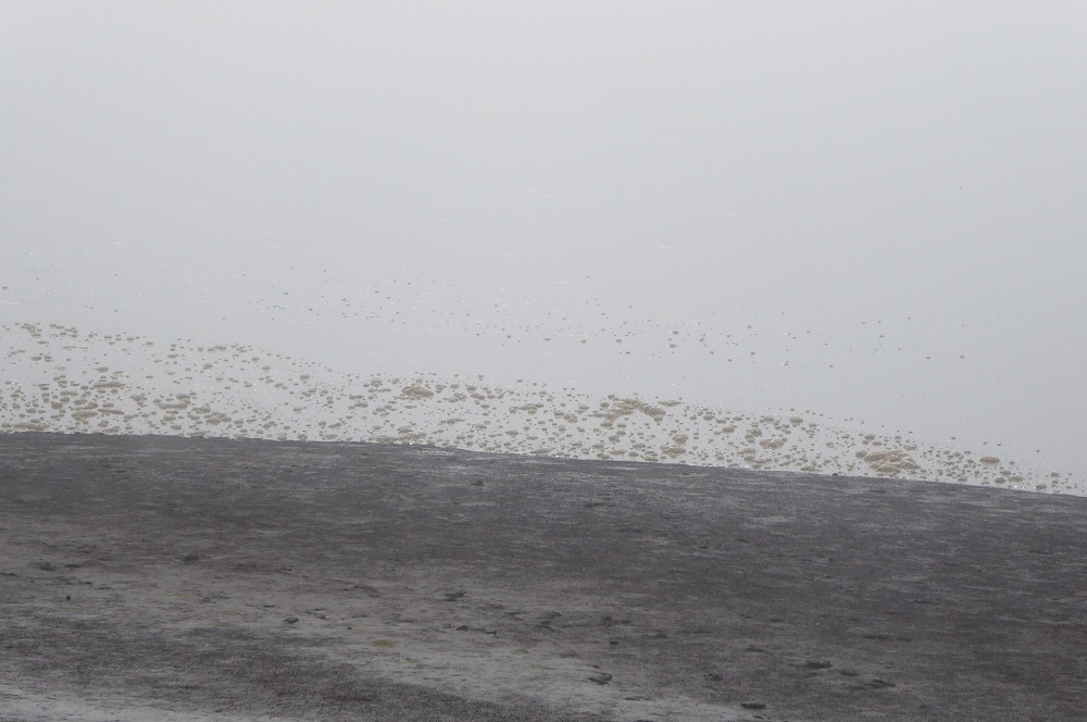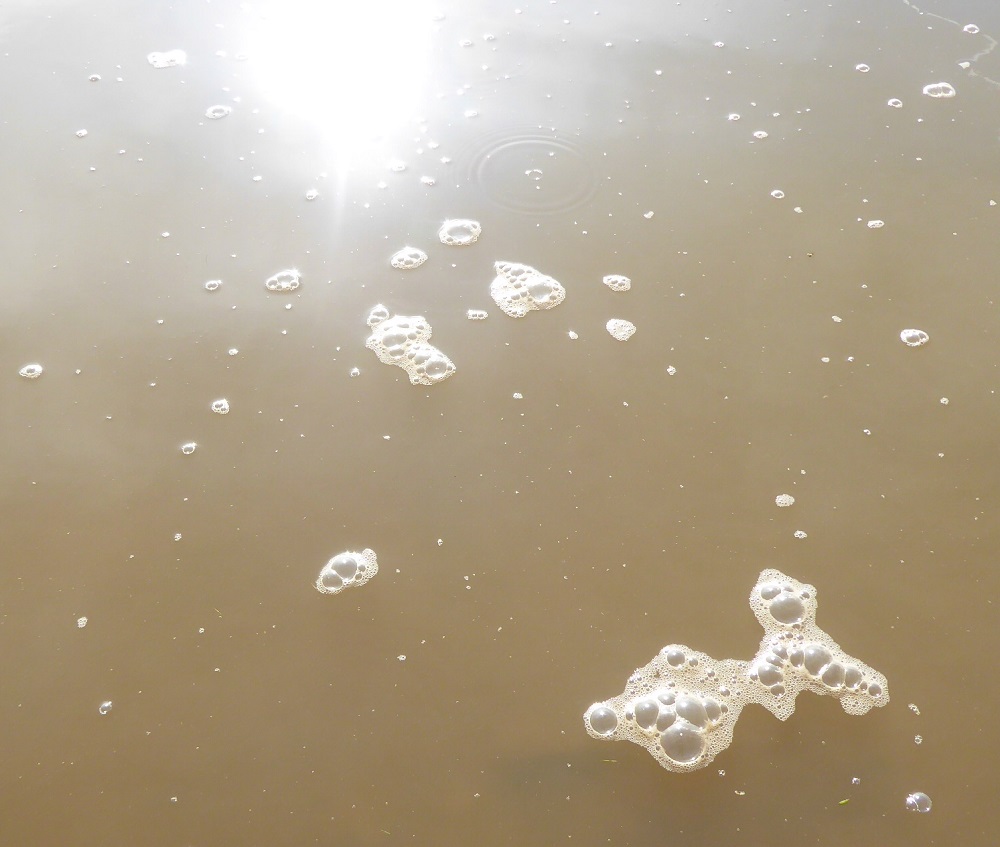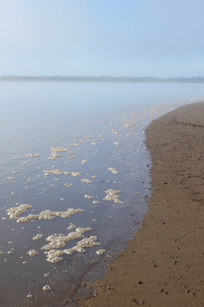 The tide has turned – the moon and sun and the tide-tables have agreed upon this. But water still flows out from the creeks, carrying froth and bubbles seawards, implying the tide too is still on the ebb. But – watch the margins – the outflowing water is rising, lifted upwards by the dense, incoming sea: pebbles on the shore are being submerged, quickly. The bubbles are suddenly indecisive – which way to go? They circle, bunching together, their surfaces brown with sediment.