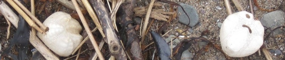 Gently, the waves carry and deposit their offerings, seeking suitable places to pile them: fine black grains of coal in the hollows between ripples; grey-white tangles of hornwrack, heaped beside a log, the minute animals dead within their skeletal cells; a small patch of knitted-together mussel-spat, like black beads on the necklace of their byssal threads. Here there is a concentration of broken shells of Common Whelks; here a patch of the white heart-shaped skeletons of the sea-urchin Echinocardium, now devoid of their spines – urchins that must have been nibbled out of their burrows by the probing tide and carried, so very gently, to the intertidal shore. The tideline is a tangle of drying wrack, mermaids’ purses and whelk eggs, but the tiny contours of the shore and the minute changes in the currents of water and wind create special resting-places where the flotsam is sorted and categorised by the waves, and filed for the next few hours.