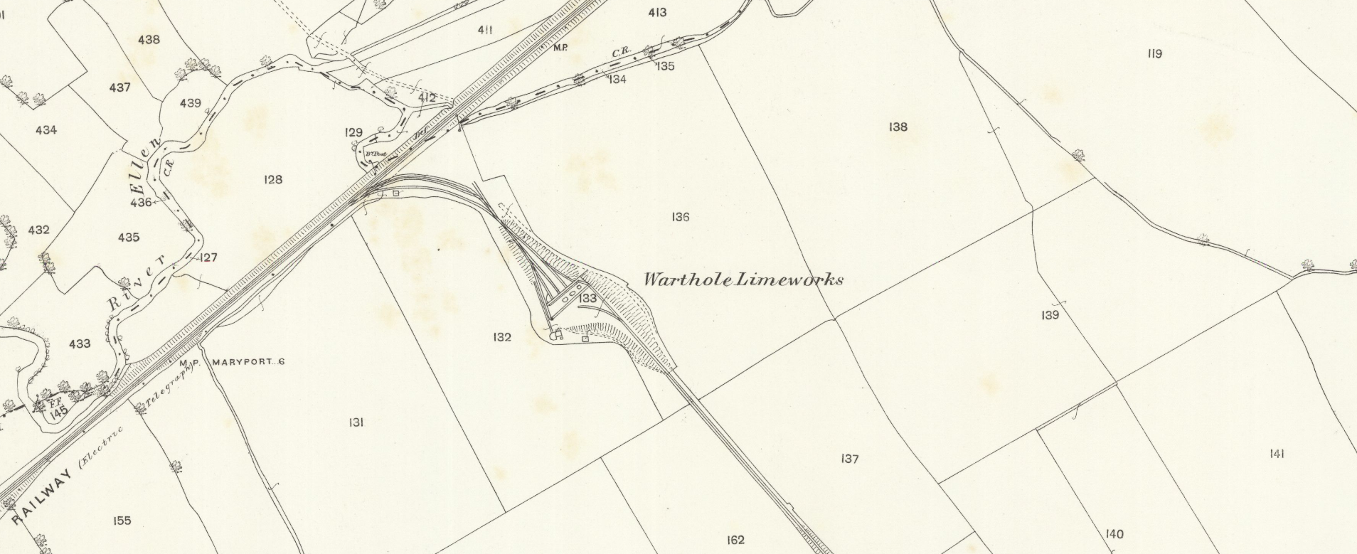 When lime-burning first started here isn’t clear, but Graham Brooks, in his research into Cumbrian limekilns [3,6] states that the Warthole kilns, “were rented out to both the Gilcrux colliery company prior to 1852 when they were advertised to be let by Mr Richardson of Dovenby Hall. (The present kilns probably date to after this time.) The Solway Haematite Iron Company, Maryport worked the quarries and kilns in the 1870s.”