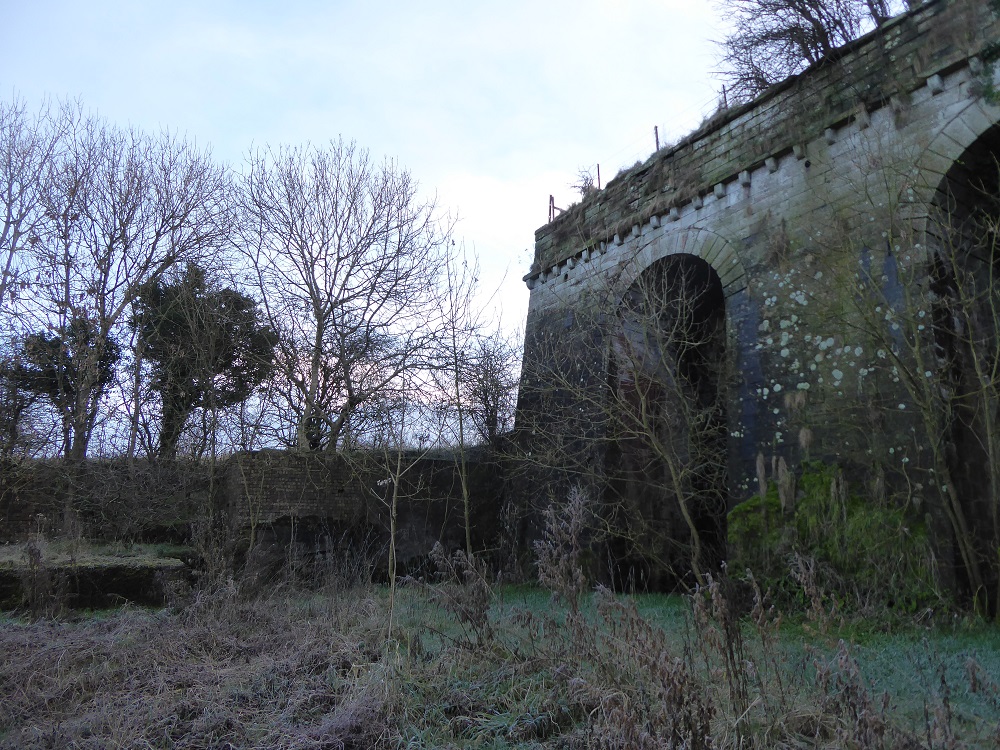 We back-track to a strip of damp woodland beside the track, and scramble down a bank, through brambles and the stalks and flat dry heads of cow parsley, frost-rimed; clamber down a low brick wall onto what might have been a platform or loading area, and then onto a plain of straggling grass and shallow moss-filled pools overlying rubble and broken brick. Now we’re at the base of the enormous flat front of the bank of kilns. The entrances to the four pots are like half-bottles, each framed in perfectly-cut and aligned sandstone blocks. The interior walls are dank with green algae and liverworts, and partly-hidden by ivy.