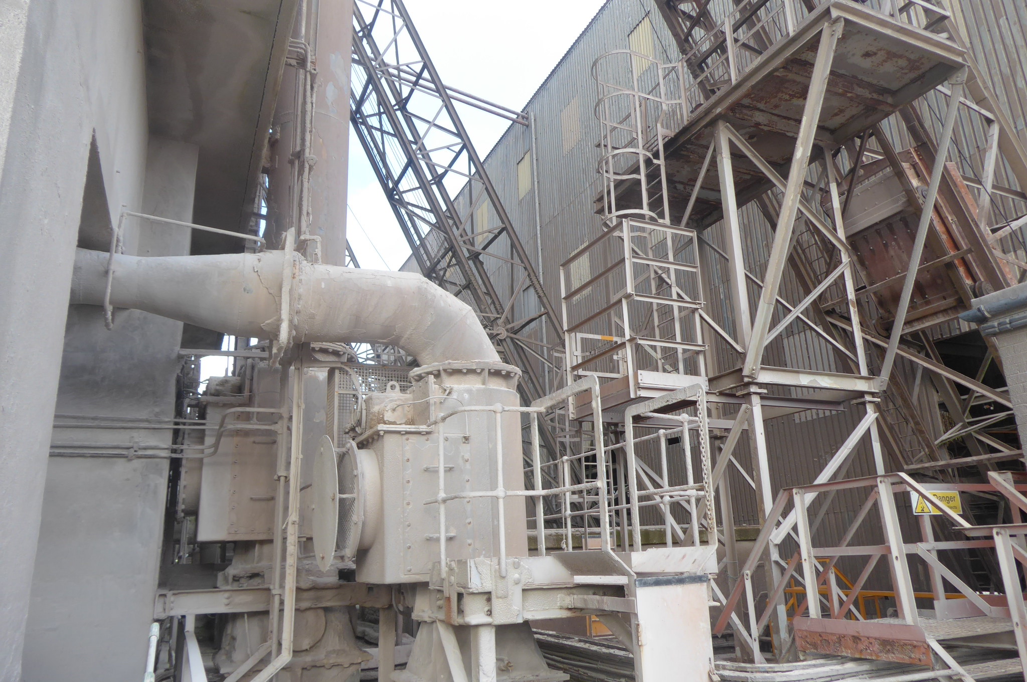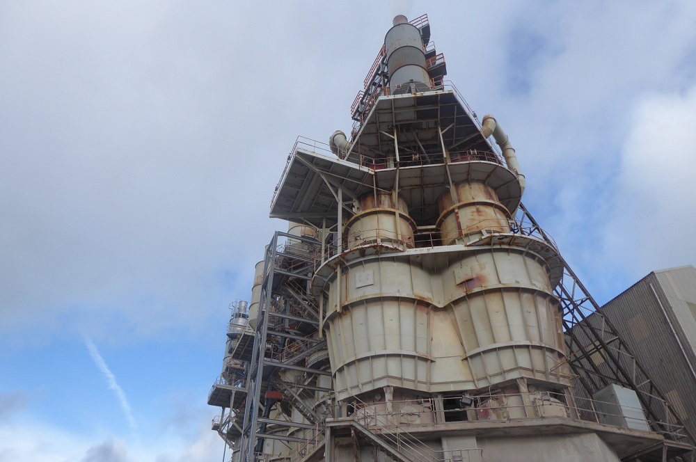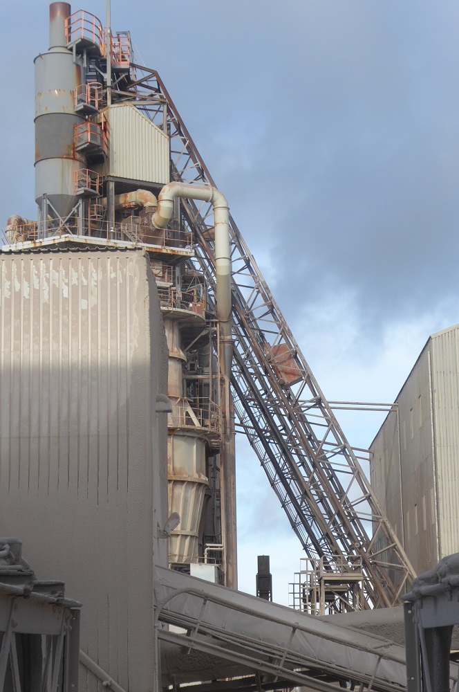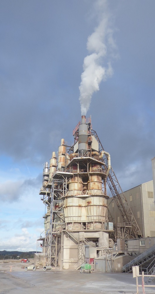 Depending on the weather, the drifts of steam coming from the chimneys may appear white, grey, or even be invisible. A system of Venturi ‘scrubbers’ cleans up some of the emissions, such as sulphur dioxide and particulates. There is water-vapour – steam – from the heating of the washed limestone; there is carbon dioxide from the burning of the methane-rich natural gas, and there is of course also a very large amount of CO2, approximately 40% of the initial weight of stone from the breakdown of CaCO3 to form CaO.