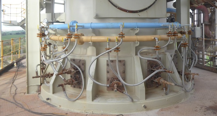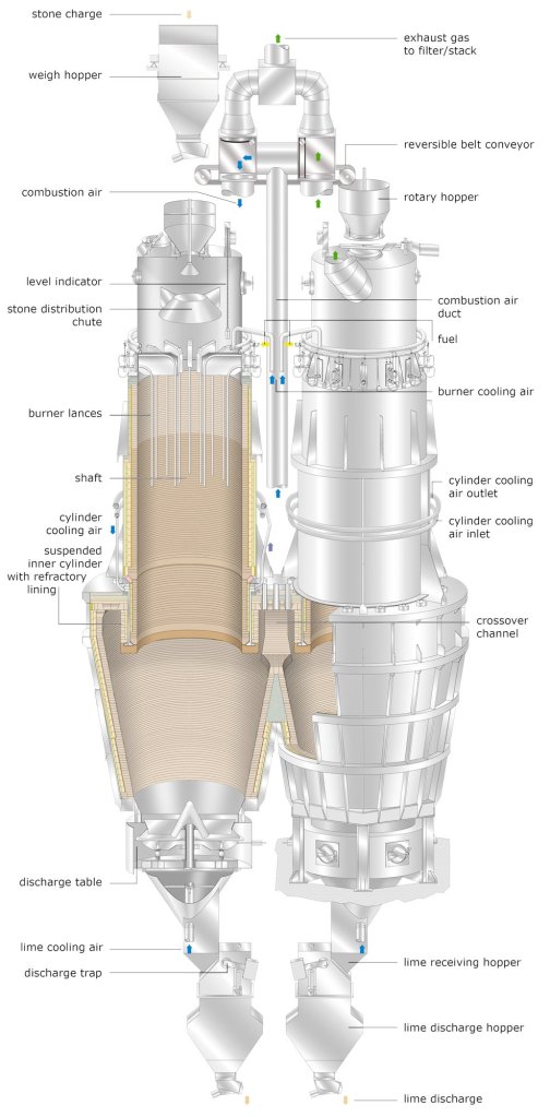 Calcining (a quick reminder) is the process of heating limestone, calcium carbonate CaCO3, to change its chemical composition by driving off carbon dioxide CO2, as gas, to leave ‘quicklime’, calcium oxide CaO. This requires temperatures in excess of 800oC which, in ‘old-fashioned’ limekilns, are produced by burning coal in the presence of air. In the Maerz kilns, heat comes from the burning of natural gas which is injected into the upper cylinder.