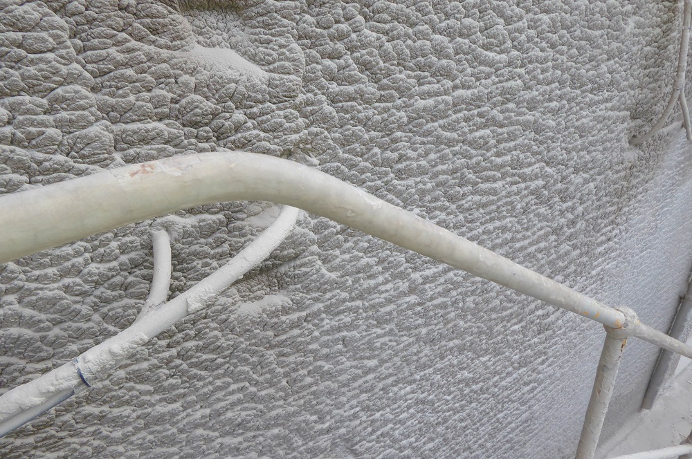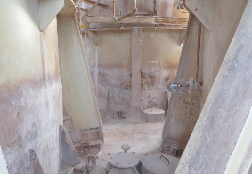 Around us all the hard surfaces are white: the handrails, the outside of the hoppers, the gantries, cranes and platforms – but it is not powdery, the whiteness is hard with a pimpled surface, smooth to touch. It must have built up over the years, but surprisingly, there is no dust.
