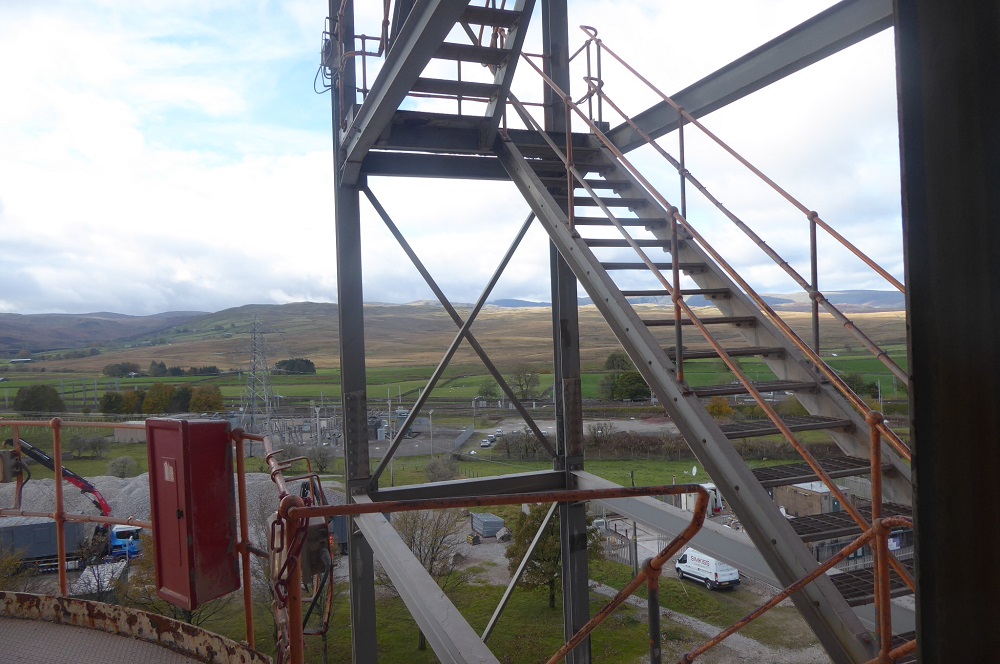 We cross a metal bridge, beneath a conveyor belt, and onto a platform from which the first flight of steps leads upwards, perforated metal stairs through which the ground below is visible; but there are sturdy handrails each side. The cylindrical wall of this bottom section of the kiln is cool but up on the second platform I can feel warmth radiating from the wall. The weather today is perfect, with little wind, but I can imagine how pleasant that warmth would be when the wind is howling across from the Howgill Fells, funnelling up the valley by Tebay.