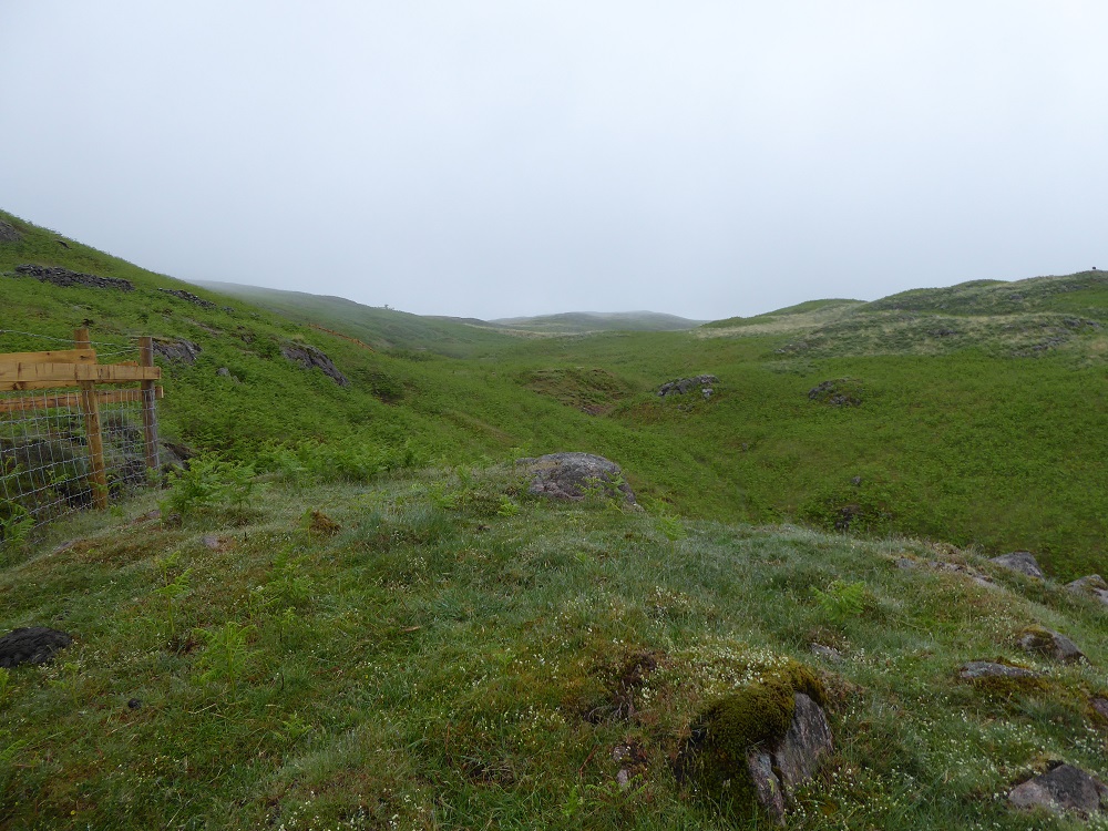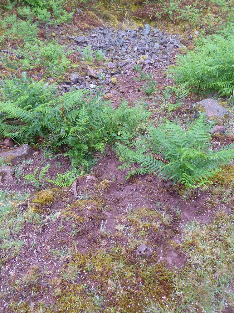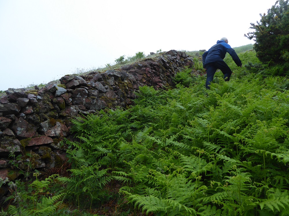 We reach the top of the gill in the drizzle; the climbing has been warm and steamy work, and the grasses are sodden, beaded with droplets of water. Here, adjacent to Level No. 1, is a deep, narrow cavity, an open stope, now protected by a new post and wire fence. We peer down into its ferny darkness, and David shows where a miner would have stood, legs braced each side of the fault as he hacked out the ore. There are also open-cast mines to the North on the top of the hill but they are overgrown, so we don’t bother to explore further.