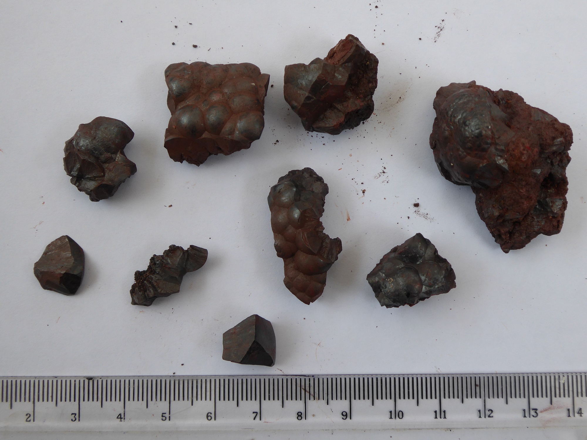 Mervyn Dodd, in his book, The Story of Iron Ore Mining in West Cumbria [2], describes how the different forms of the ore arise: veins are steep and narrow bodies of ore close to faults; flats, as their name suggests, follow the layers of rock; and there are vugs, which are spaces within the rock where irregular shapes like the kidney ore can grow. Some of the kidney shapes can grow to a massive size, like the one from Hodbarrow, and smaller versions were often seen being used as doorstops in the mining areas.