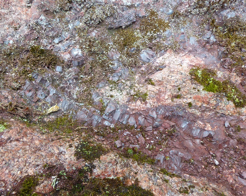 The haematite workings at Nab Gill were in five levels, connected by shafts, and followed a vein of ore that trended North-North-West, presumably along the same fault-line eroded by the gill and along which the iron-rich fluids must once have trickled. The gill, a deep and heavily-vegetated cleft in the hillside, no longer flows with water, probably because it has been considerably altered by the mining operations which started in about 1870 and finally ended in 1917. The slippery path up the cleft has been cleared in places, perhaps by other geologists, and David pauses to show me a small round rock that has been brecciated – it formed by the granite splitting and iron salts infiltrating, so that the fragments of pinkish granite became cemented together with a dark purple glue of haematite. Wherever the soil is exposed, it is red and crumbly.