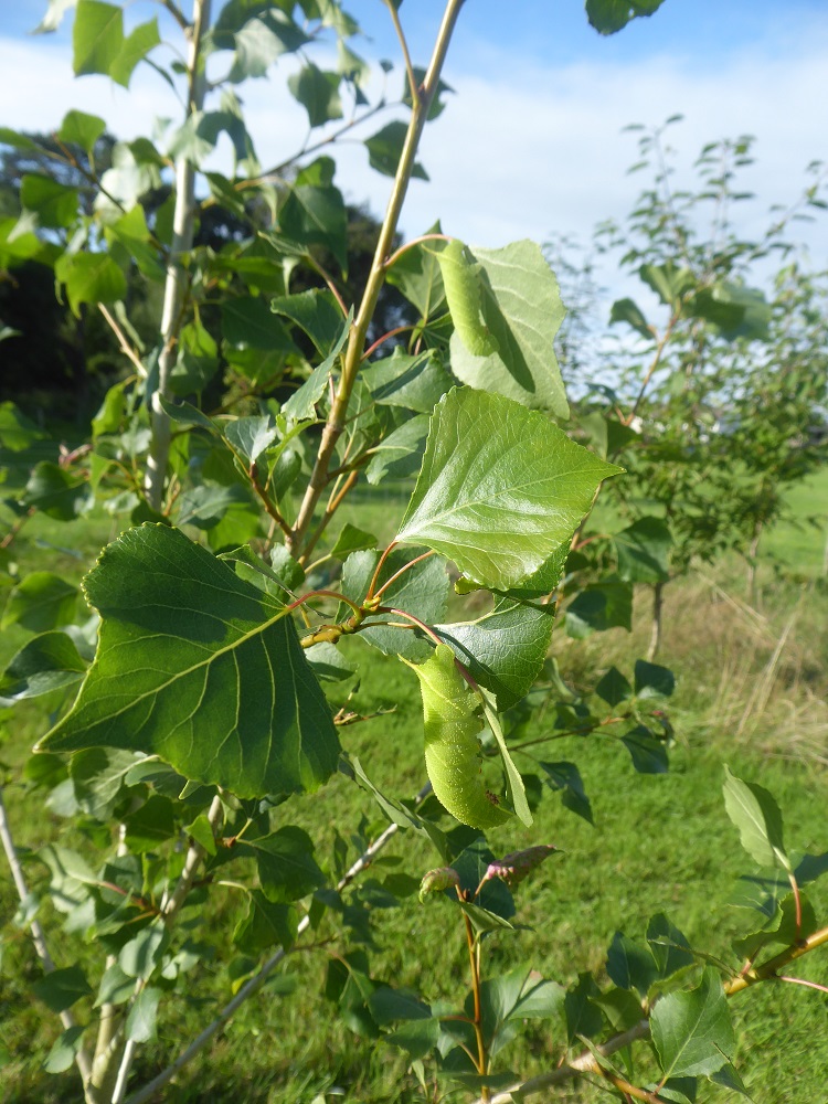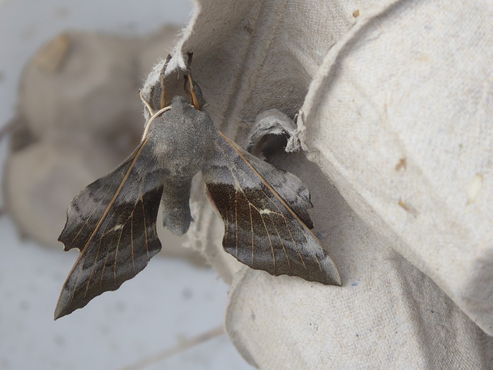 The first outing for our home-made moth trap caught a wide variety of species. I’m a complete novice at moth ID but there was one huge and very easy-to-identify specimen sitting quietly amongst the egg-boxes – a poplar hawk moth. We have caught several subsequently. But now we have the entire life-cycle on the small-holding! In August a fat green caterpillar hung on a leaf of one of the black poplars; within a couple of weeks, there were twelve on the one young sapling, chomping at the leaves, getting fatter day by day. They gradually vanished, presumably dropping off to pupate – and leaving the sapling stripped of all its leaves.
