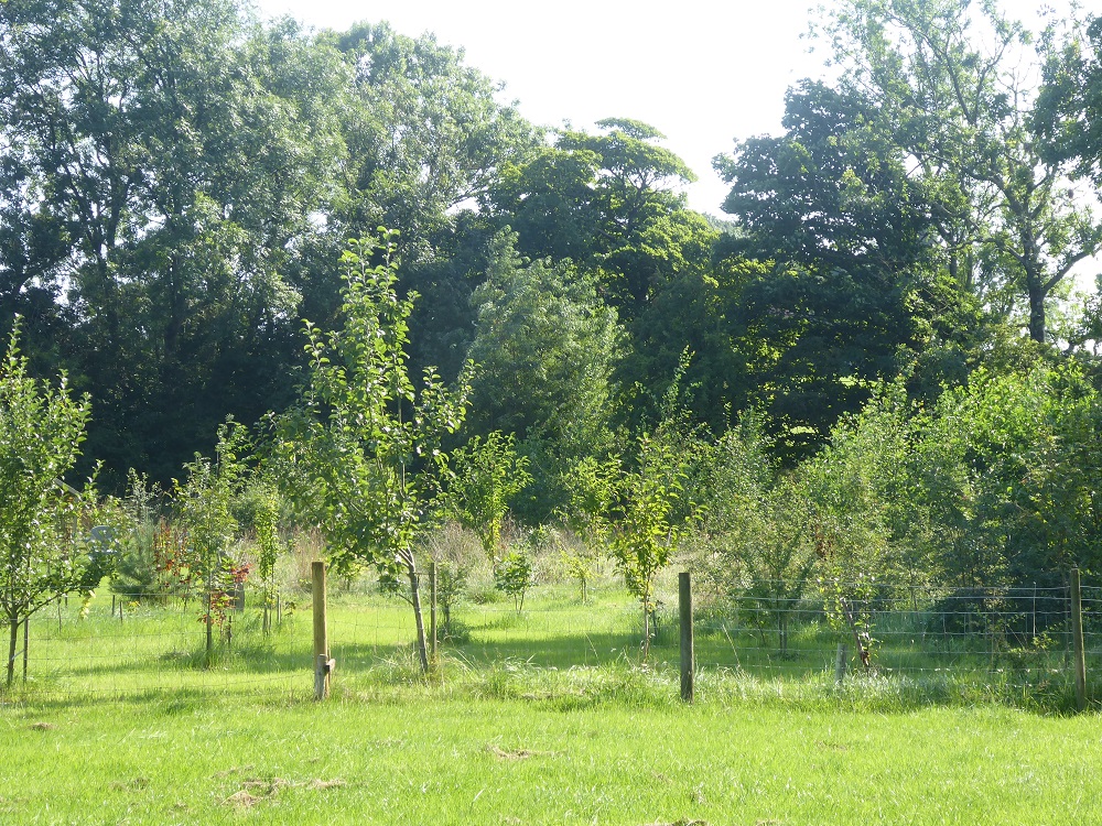 After reading Benedict Macdonald’s and Nick Gates’ delightful ‘Orchard’, John was inspired to buy a dozen or so old-fashioned types of cider and eating apple and intersperse them amongst the other trees: we now have ‘Pineapple’ and Keswick Codling varieties amongst others, all doing well. It will be a few years before we get enough fruits to pick (‘if we’re spared’, in that lovely Scottish saying – the ‘official’ name of the wood holds a clue!)
