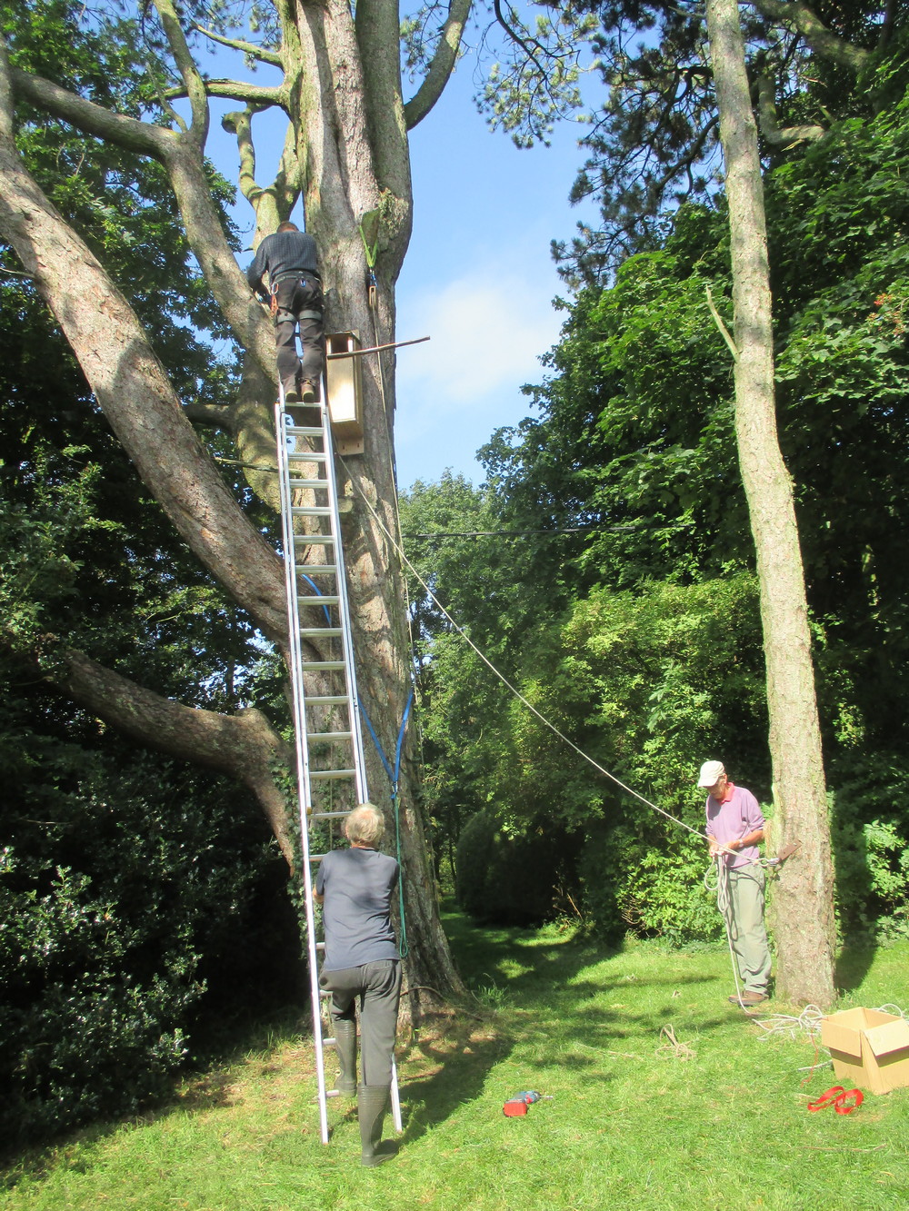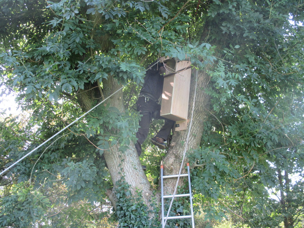 The tawny owls returned to the area; in August our elder daughter and her husband were closely observed by two young owls at the edge of the new wood. This prompted John to make a couple of nest-boxes, and a very merry time was had when friends came to assist – with many helpful suggestions, and over-engineered solutions – to raise them into the trees. There have been no signs of use, but last week a pair of tawnies were calling and chatting near the boxes, perhaps checking out the new properties. We continue to hope.