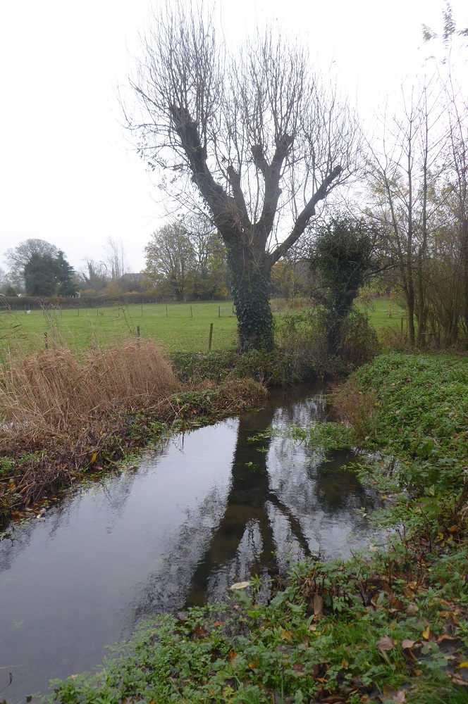 Soon after the dredging, dark-green blanket weed grew because there were insufficient numbers of snails to keep it in check; but it has now decreased, snails are visible crawling across the mud; the banks have re-vegetated. Water-mint, yellow flags, marsh marigolds, water forget-me-not, water-cress and sedges are still there, supporting life. Heavy rainfall in November over-filled the pond and the field fulfilled its other purpose as a temporary water-meadow. The pond now looks much healthier. Will dragonflies visit next year? If the pattern of the past few years continues, the water level will once again oscillate between too low and the flash-flooding which brings down thick sediment.