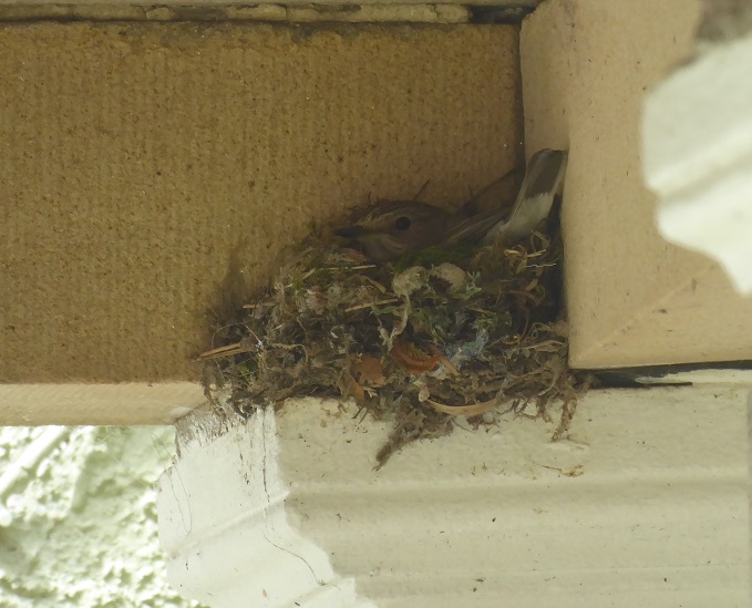 Shortly after my last blog-post when I mentioned that I hadn’t seen spotted flycatchers for may years – a pair arrived! And, of all places, they chose a nest site inside the open-sided porch next to the kitchen; a place where the sitting female was disturbed almost every day by the postie and other deliveries. For the two years they nested there we had the absolute joy of watching them perching on the fence opposite the kitchen window, scanning intently for insects, and swooping, twirling, dancing, after their prey. This year, they made their nest elsewhere – we would see them hunting from the fence at the edge of the field, or from one of the evergreen trees in the garden – but after a while we worried that the nest and perhaps the female had been savaged, because soon only one bird was seen, hunting in many different places in the small-holding (and appearing disconsolate to human eyes).