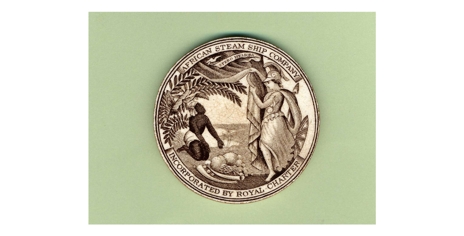 According to the Curator’s information on the BM website [1], the ASS medallion in their collection dates from 1852, and was made of pale earthenware by the Davenport Porcelain company in Staffordshire, with the name Davenport impressed on the base – but my attempts to find out more failed, as the company no longer exists. A similar brown transfer design is in the centre of a Davenport bowl (it can just be seen in the Wooley & Wallace auction catalogue [16]). Other pieces with the ASS device were, for example, in dinner sets made by Minton; some were blue, but a 2019 catalogue for Charles Miller auctioneers shows a ‘Rare African Steamship Company [Elder Dempster Line] ‘Alton’ pattern dinner plate, by Minton, circa 1880’, with the brown transfer design in the centre of a slightly stained white plate that is about 26 cms diameter [17].
