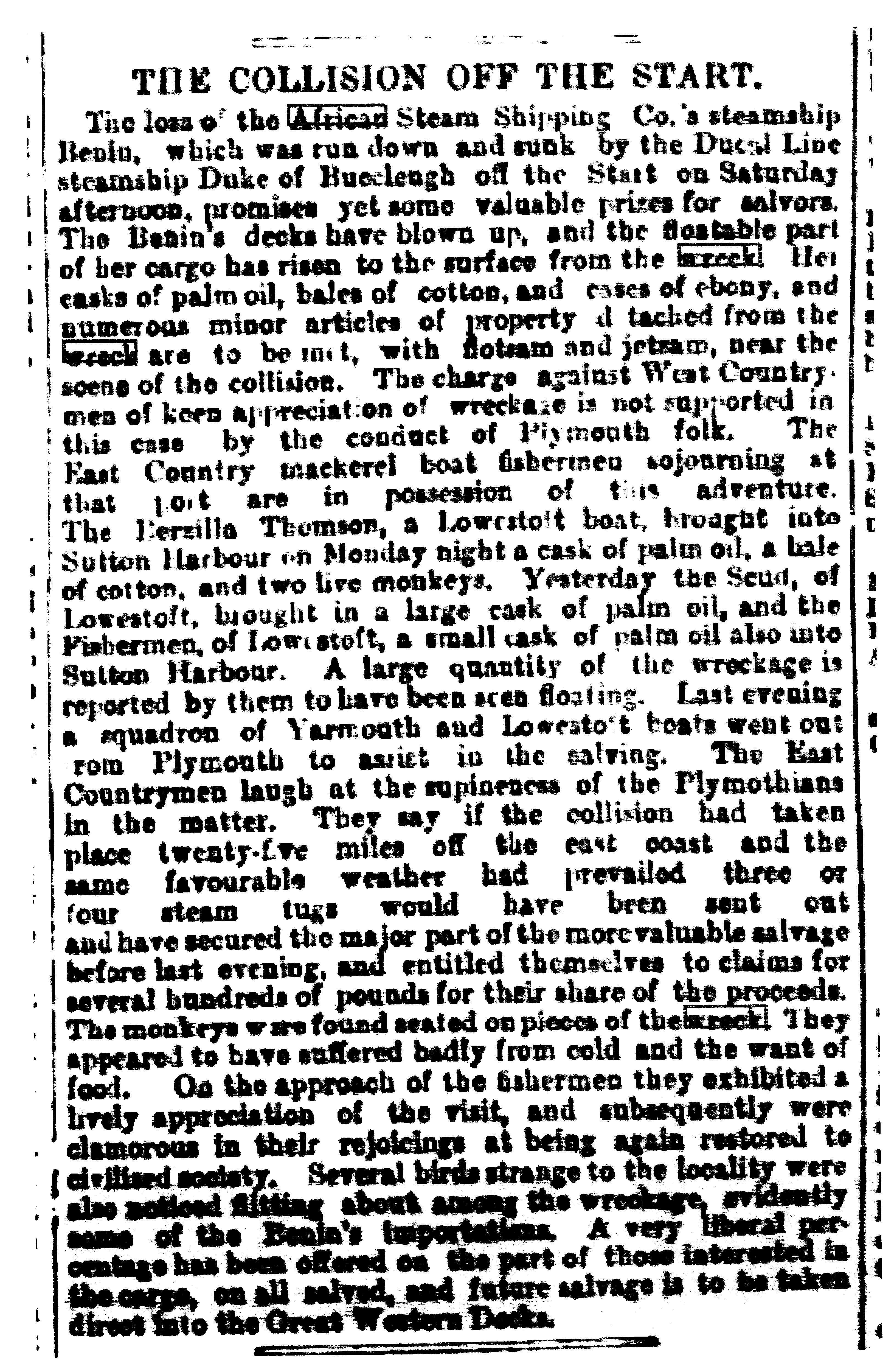 My long-time friend, Dr Peter Stanier, an industrial archaeologist who has also always been interested in shipping, discovered an article in the Western Morning News of March 16th 1881, describing the end of the ASS ship Benin, ‘run down and sunk’ by a steamship of the Ducal Line, the Duke of Buccleuch, off Start Point. Salvaged objects included barrels of palm oil, bales of cotton and two monkeys ‘found seated on pieces of the wreck’ [11]. (There’s another, indirect, Solway link here: the Duke of Buccleuch was built in Barrow in Furness. A few years after colliding with and sinking the Benin, she had yet another collision, with a sailing ship off Brighton, and sank [19].)