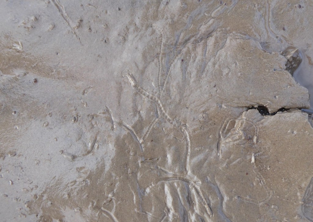 These are signs that animals have been busy on the surface while the tide is out, but the minute holes hint at other animals that are here for much longer periods, burrowed down below. For to live on this apparently featureless and changeable shore means there is nowhere to hide – except within the mud.
