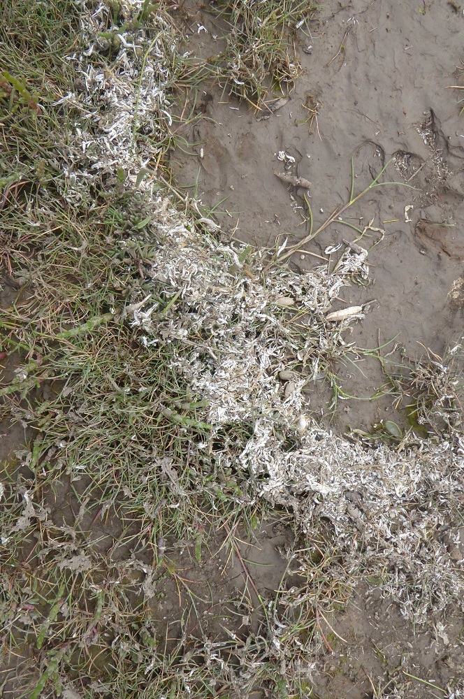 Snowdrifts! Small semicircles and rippling lines of white on the grass of the saltmarsh: the cast exoskeletons of thousands of mudshrimps. My friend and former colleague Professor Geoff Moore (himself an expert on amphipod crustaceans including Corophium) once told me how, on the Isle of Cumbrae, he had seen drifts of cast skeletons “lying along the tideline like snowflakes”. I had been envious – but now, here on the marsh at Grune Point, I had at last seen the same phenomenon.