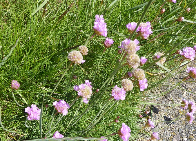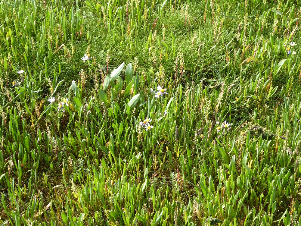 The different tiers have characteristically different vegetation, the less salt-tolerant species at the top (like gorse, rushes); many of the flowering plants (salt-tolerant ie halophiles) are in the middle layer, flowering at different times of year (only a few asters were in flower when we were there).