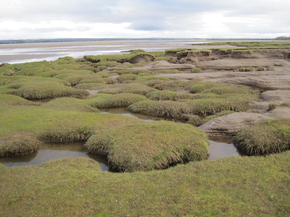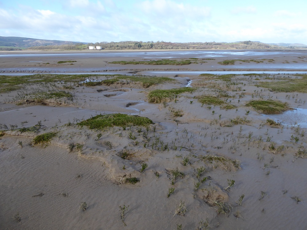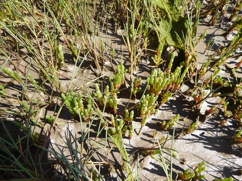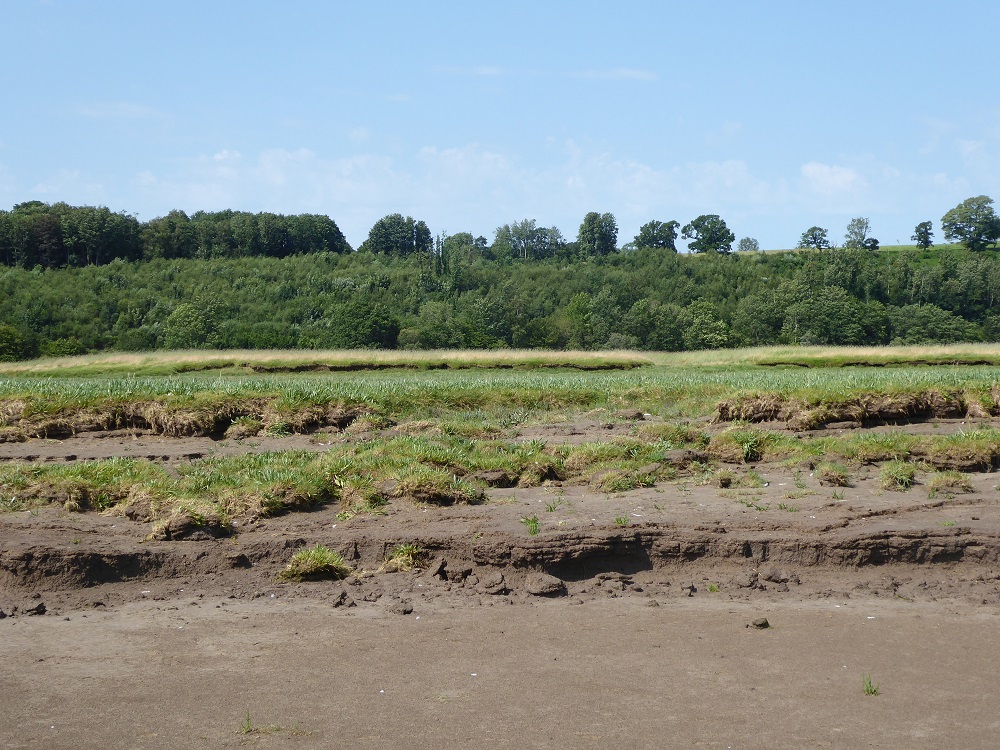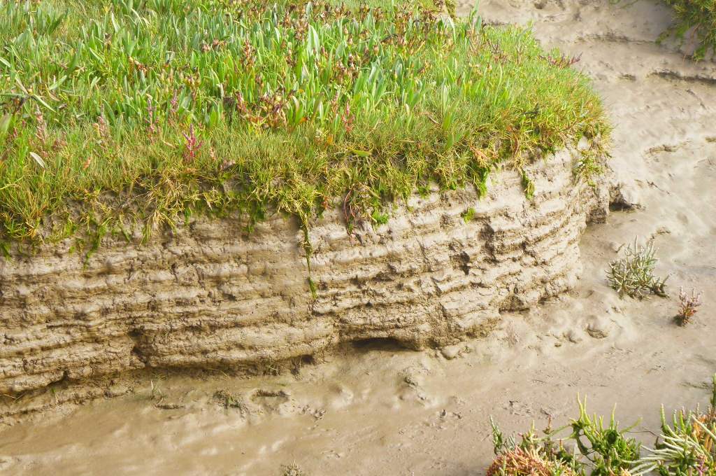 A ‘classic’ saltmarsh has three tiers, formed as it grows outwards (accretes) and upwards, gathering and trapping and compacting sediment. The new edge, next to the estuary, is stabilised by the growth of pioneer plants like samphire, Salicornia, and the ‘invasive non-native’ grass, Spartina (it originally came from America) which trap sediment between their roots and in the ‘stationary layer’ of water at their base.