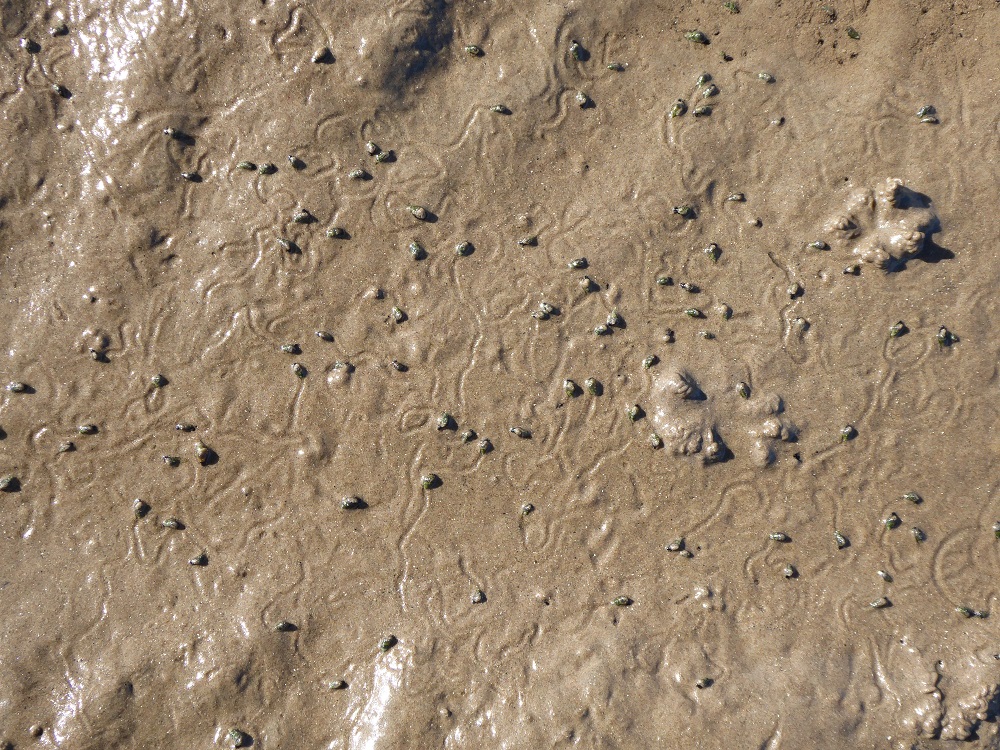 Mudshrimps (Corophium), mudsnails, ragworms, and lugworms – live in or on the mud.