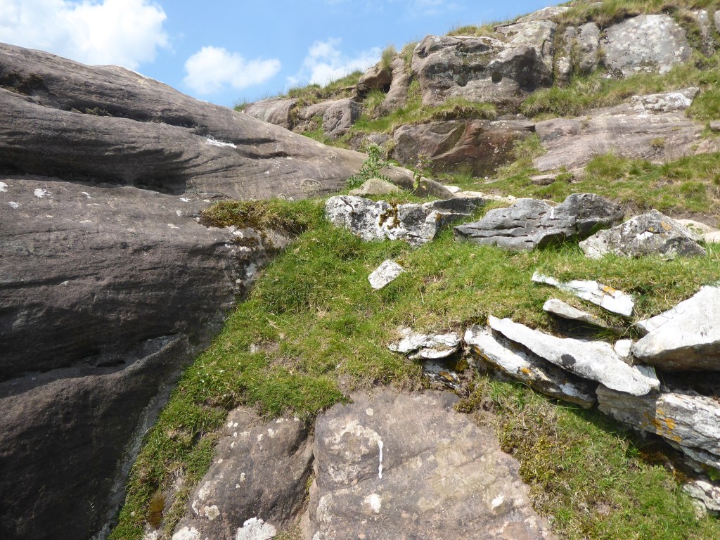 At the eastern end, near Bents farm, names have been carved in the sandstone boulders. Many are weathered and, part-obscured by lichen, are difficult to read; the beautifully-engraved J Smith (or is it Smillie?) Bolland dates back to 1888; other names are even older.