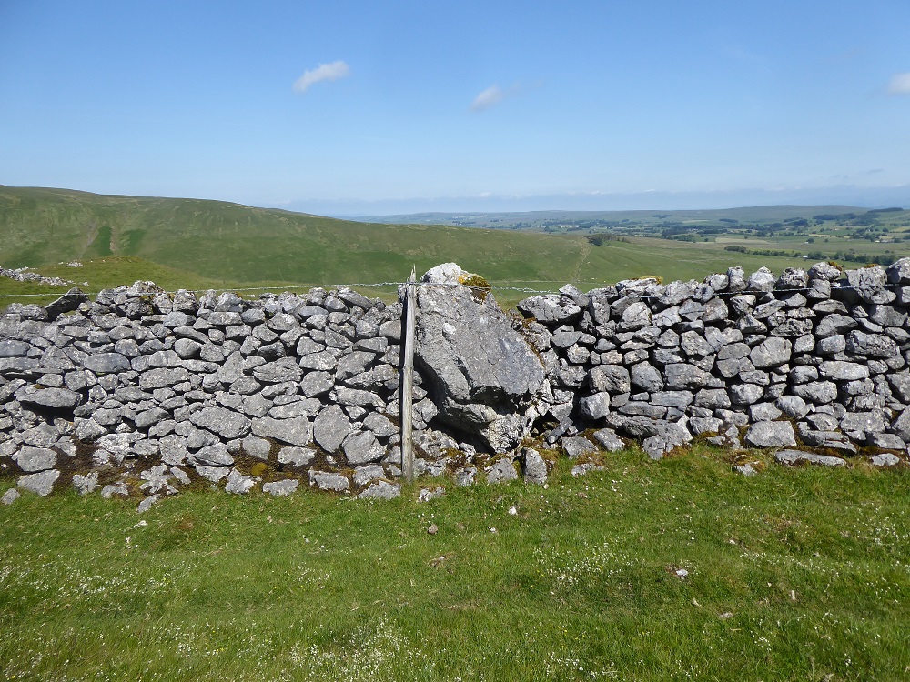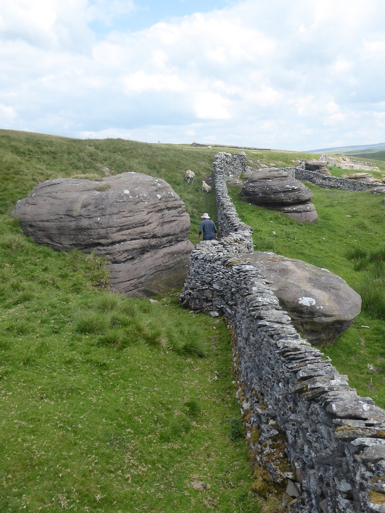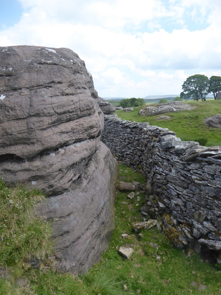 Where the limestone wall jumps to the top of a Bents boulder, the waller has incorporated chunky sandstone blocks to give the free end extra stability and majesty: limestone and sandstone intermingling their organic and inorganic origins.