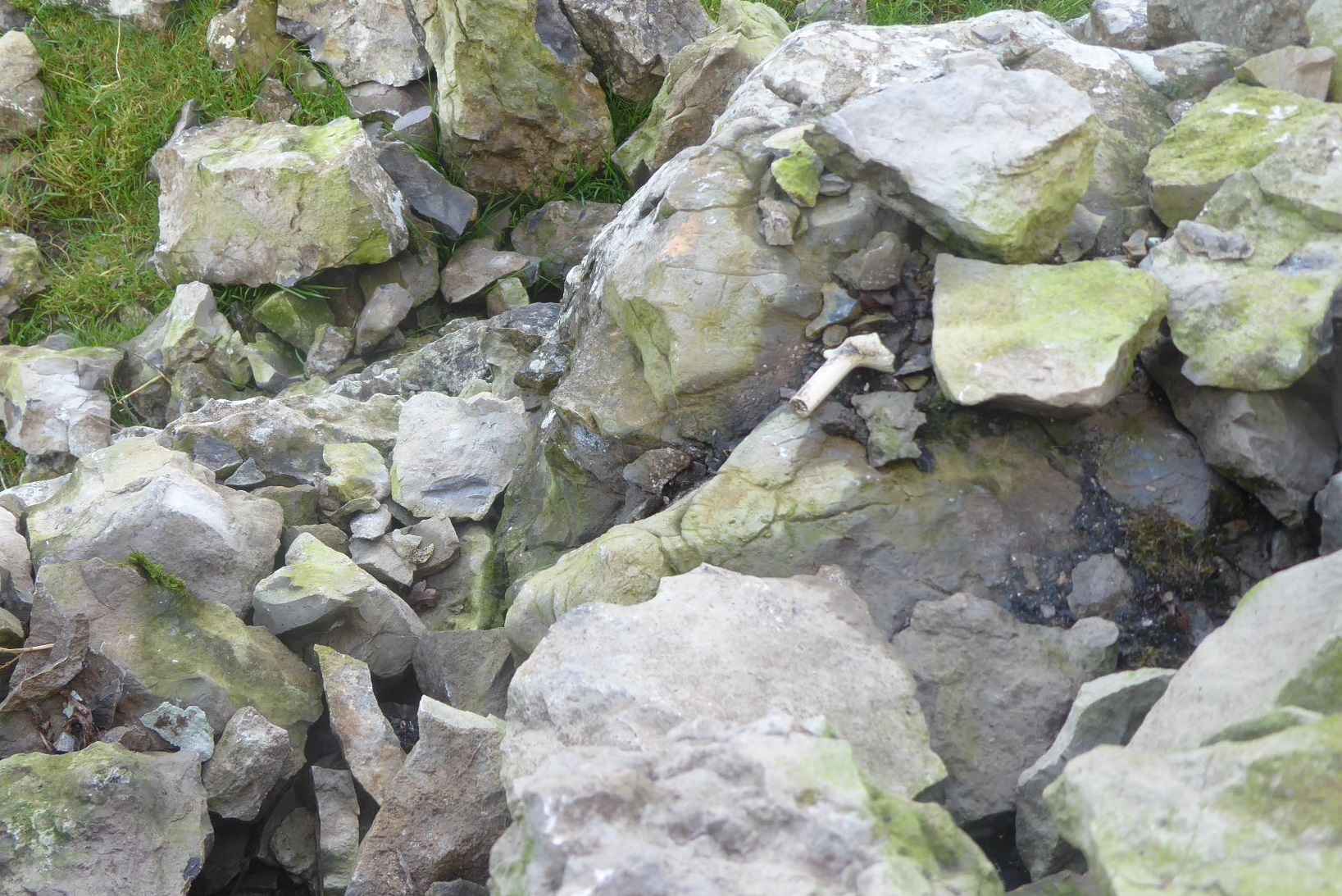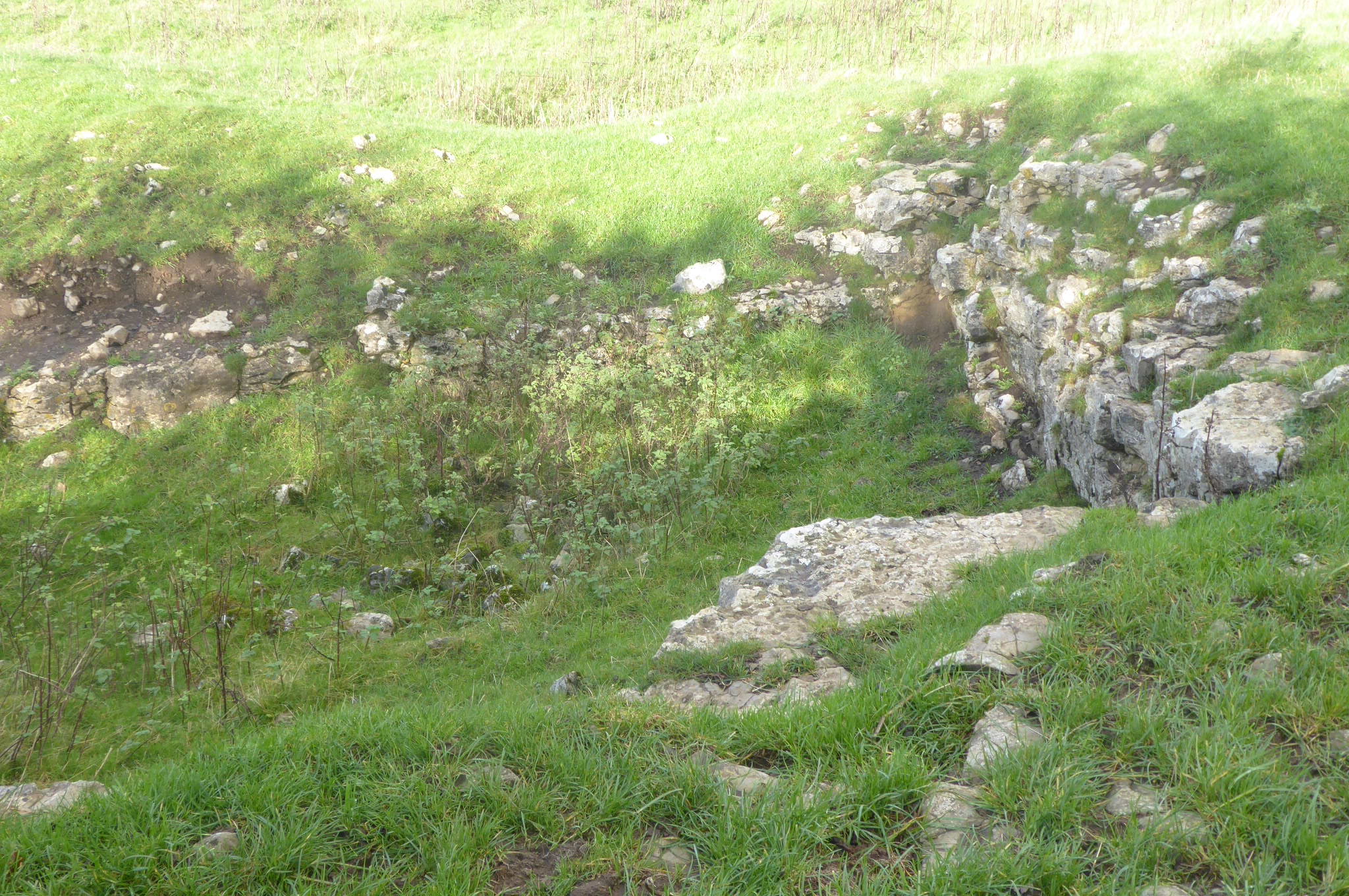 On one side a stretch of wall is intact, constructed of chunky blocks and with large coping stones. There is an unusual pit, looking man-made rather than a natural sink-hole, in the field beyond. The fraying blue twine that fastens the nearby metal gate to its sandstone stoop has been chewed by the sheep to make a tangled knot, so I climb over, and poke around in the shallow, rectangular depression in the field. It has clearly been a small quarry, hacked out by the wallers as a source of stone: water-worn vertical joints and horizontal layers have presented the limestone in handy blocks, ready for prising out and manoeuvring to the wall.