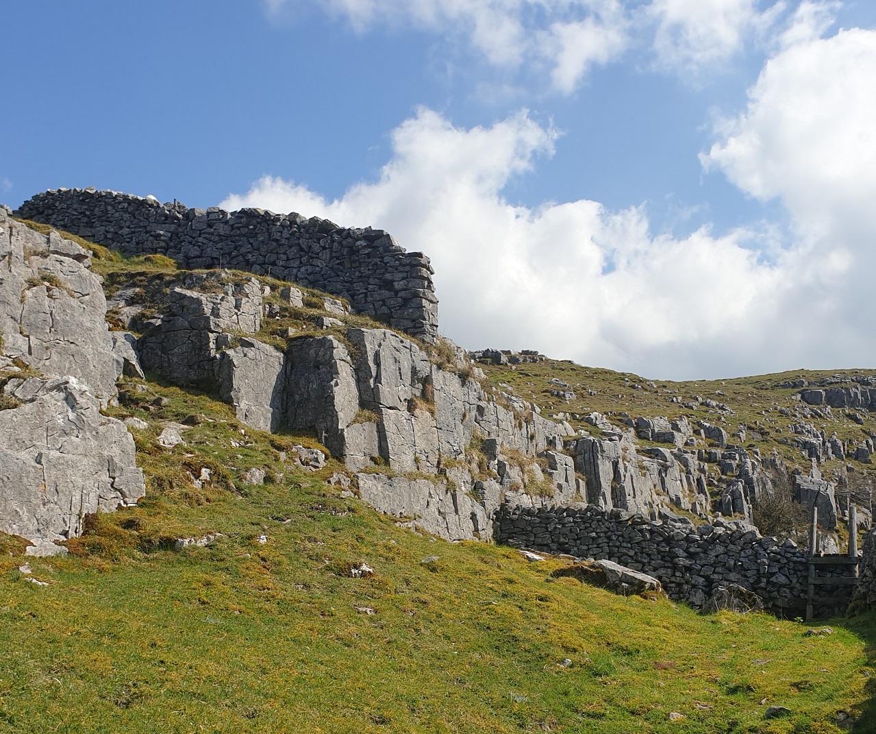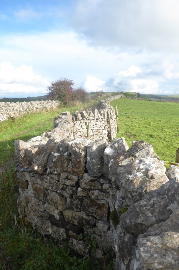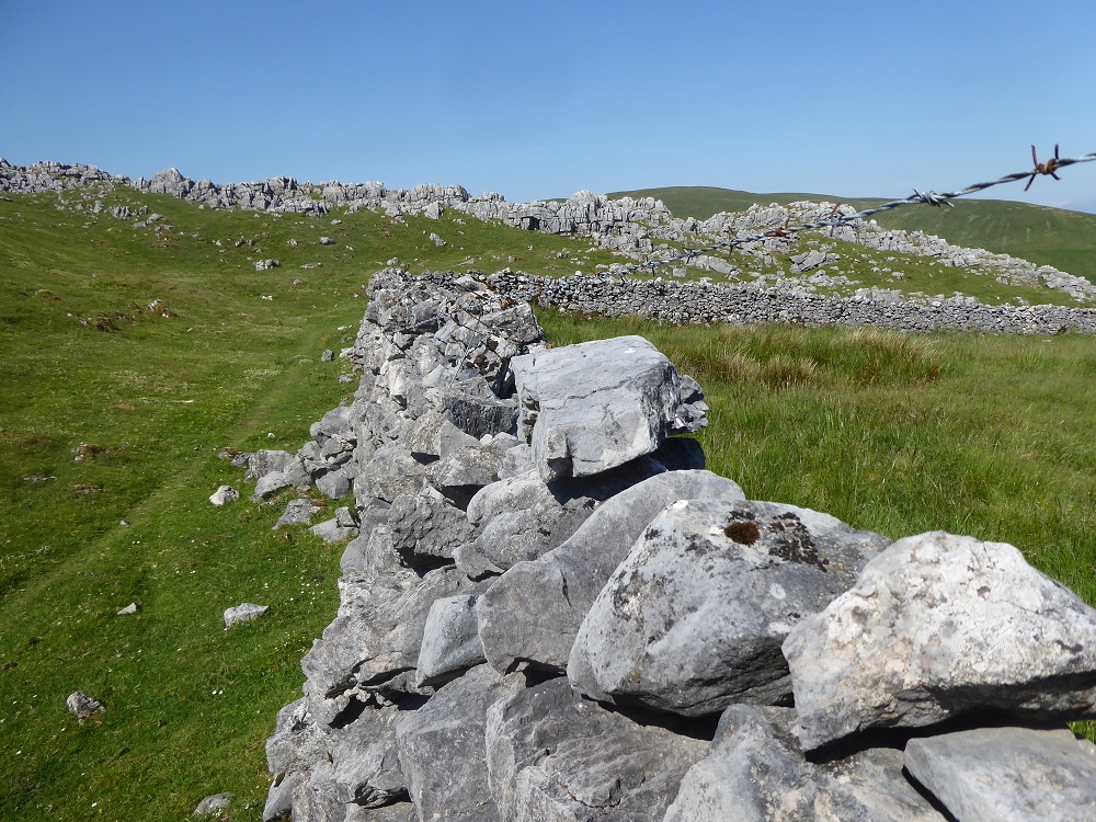 Limestone is rarely used in single-thickness walls – it’s more usual to use tougher stone like granite (as at Kippford on the Scottish side of the Solway) – but on the fellside amongst The Clouds near Ravenstonedale, there are scrappy limestone walls, some single, some built from stones cleared from the fields around the now-derelict Harry’s House. Many of the walls not ageing well, and are strung about with posts and wire.
