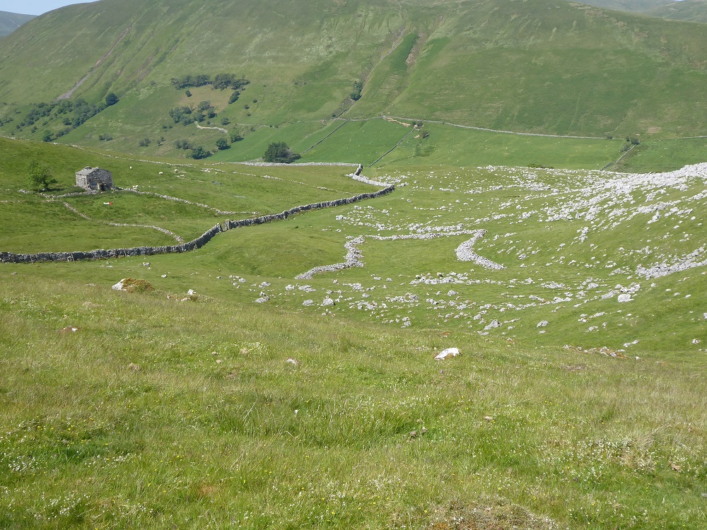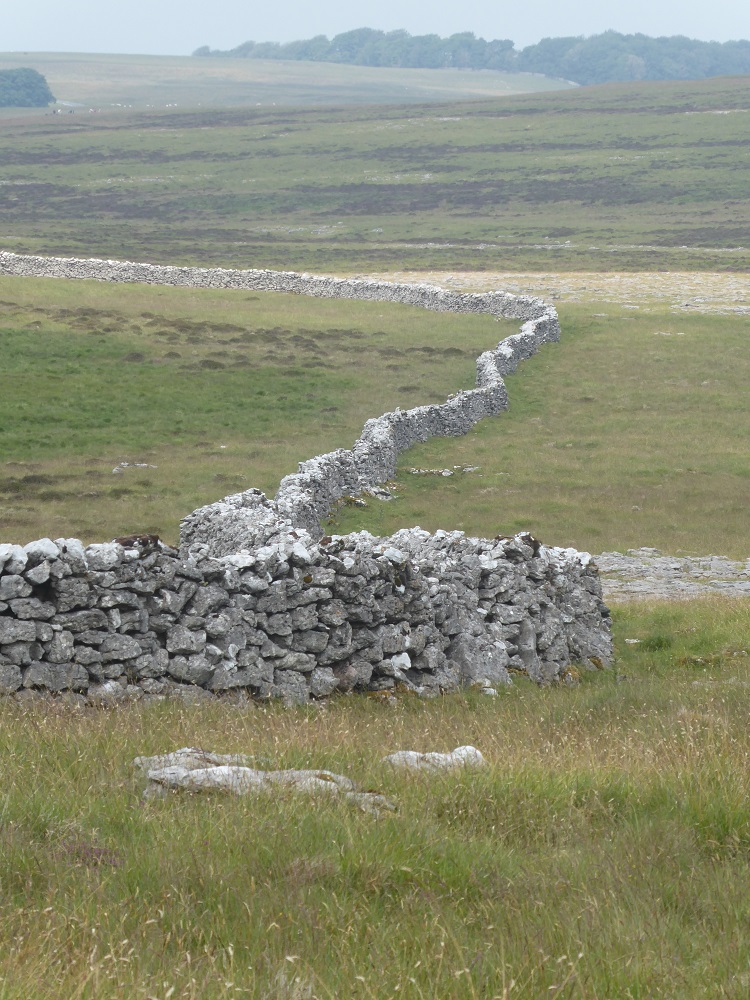 The Great Asby walls are tall and ‘tight’ – they march across the moor with straight lines and sharp corners, but walls nearer to the road are freer and more curvaceous, as they drop down into the shallow valley. Walls wiggle to avoid obstacles, such as sinkholes or springs or patches of bog. In areas where there is a shortage of stone and the wall is only one stone thick, wiggles might also be constructed to give the wall strength, against the lateral pressure of the wind. (Such sinuously-wiggling walls, usually built of brick rather than of stone, are known as ‘crinkle-crankle’ walls.)