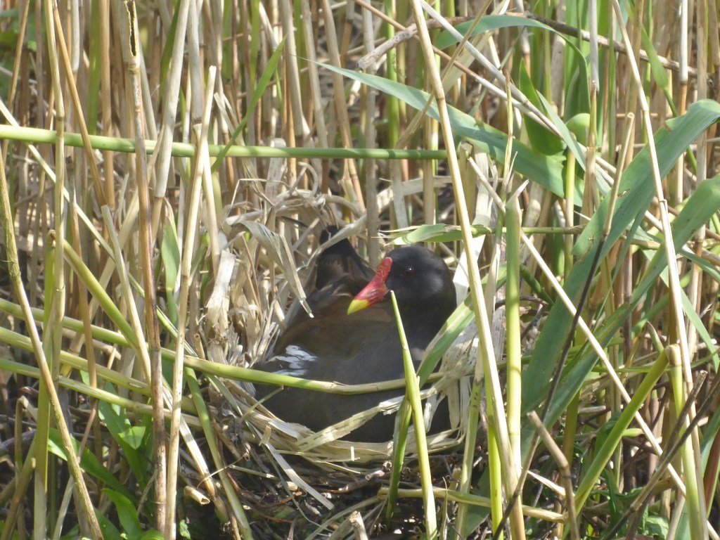 A few days after I posted this, I thought I was hallucinating – a moorhen wandered past the kitchen window. About a week later, there was a nest amongst the reeds. Then 4 eggs. But only one moorhen. However, the trailcam gave away their secret – there were, of course, two birds, who met up and changed places in the evening and night. There is now always one on the nest, the other occasionally seen in the boggy patch in the next-door field, or lurking at the edge of the pond. The brooding period is 20-21 days, so we look forward to seeing babies. Meanwhile, the mallard sitting on her nest on the island, just a couple of metres from the moorhens, has hatched 8 chicks after 28 days – and after a day pottering around the pond, has taken them away, who knows where? We wish them luck and a happy life. The diversity and number of invertebrates in the pond has no doubt had a set-back …