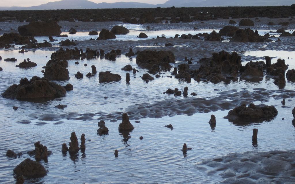 The worms – Sabellaria alveolata – each build a protective tube around themselves, using their tentacles and sticky mucus (they have no eyes!) to select sand grains of the right size and stick them edge-to-edge. Aggregations of the tubes form dramatic and sculptural blocks of reef that trap sea-water in lagoons and small pools as the tide goes out.