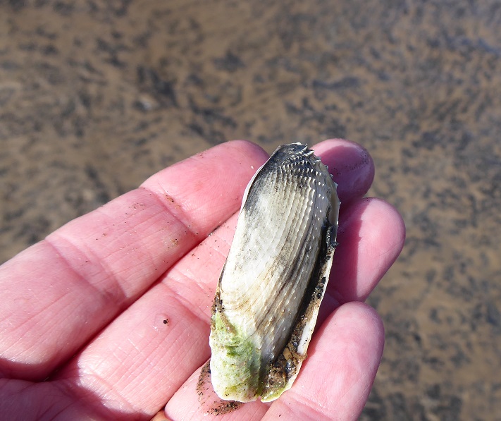 Occasionally the banks of peat formed after the last glaciers retreated are uncovered by the sea, and some lucky piddock larvae found them and bored into this rather softer substratum. This might have been as long as about 5-6000 years ago. The peat has been covered by sand and sea and then uncovered again, perhaps several times. The piddocks we can find in the exposed peat (if we are very lucky) are long-dead. .