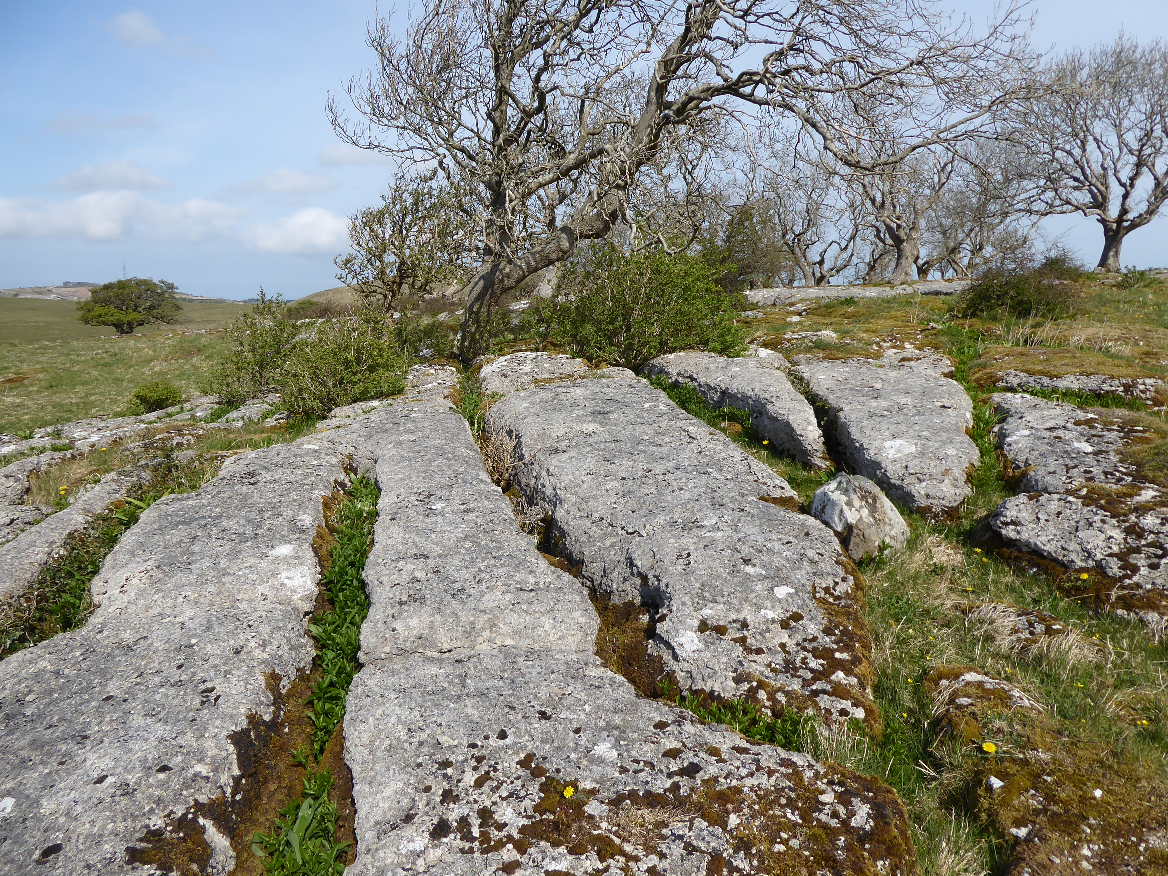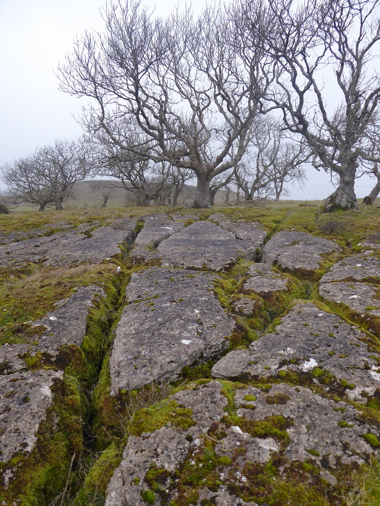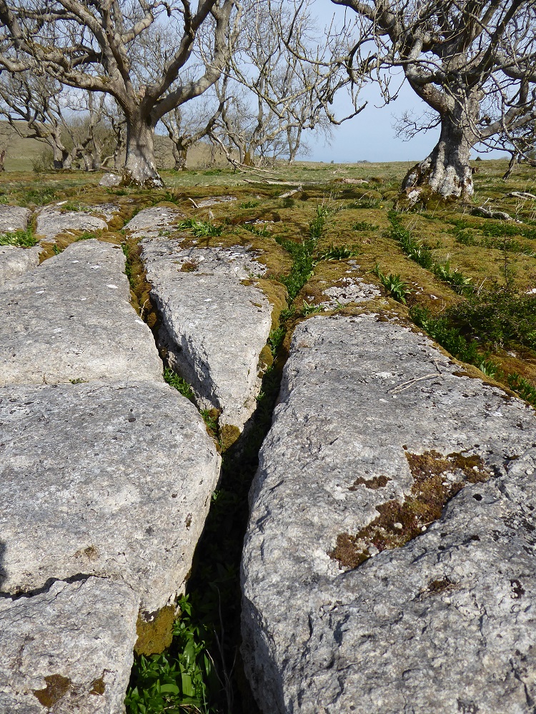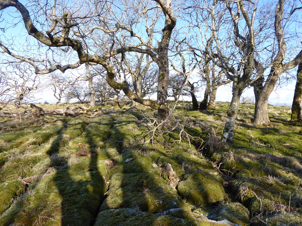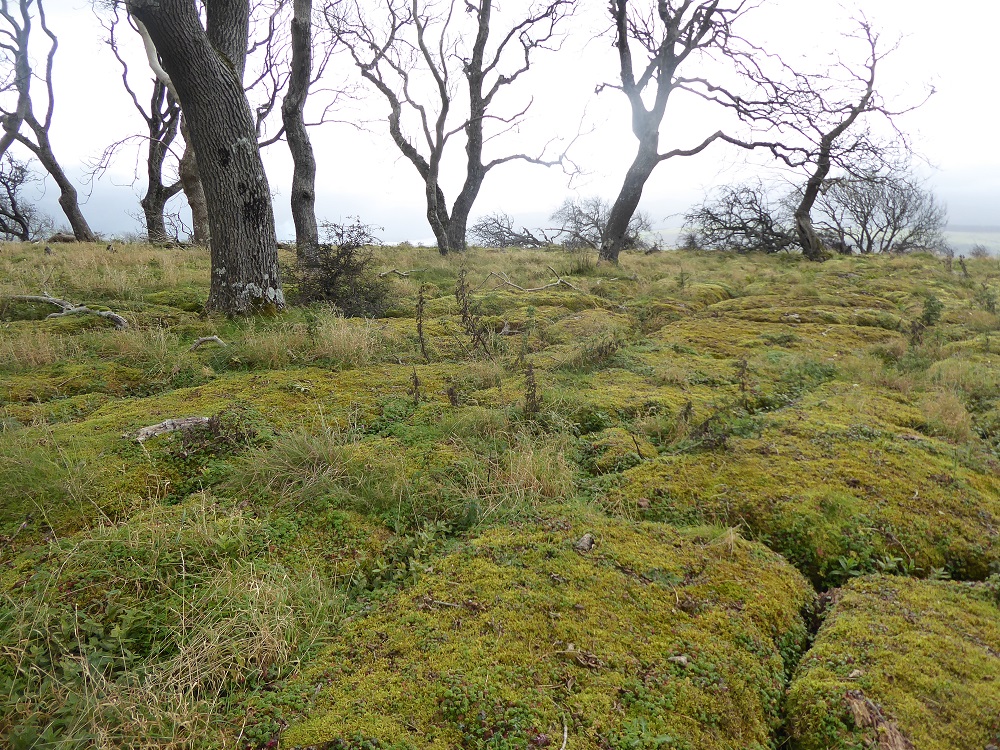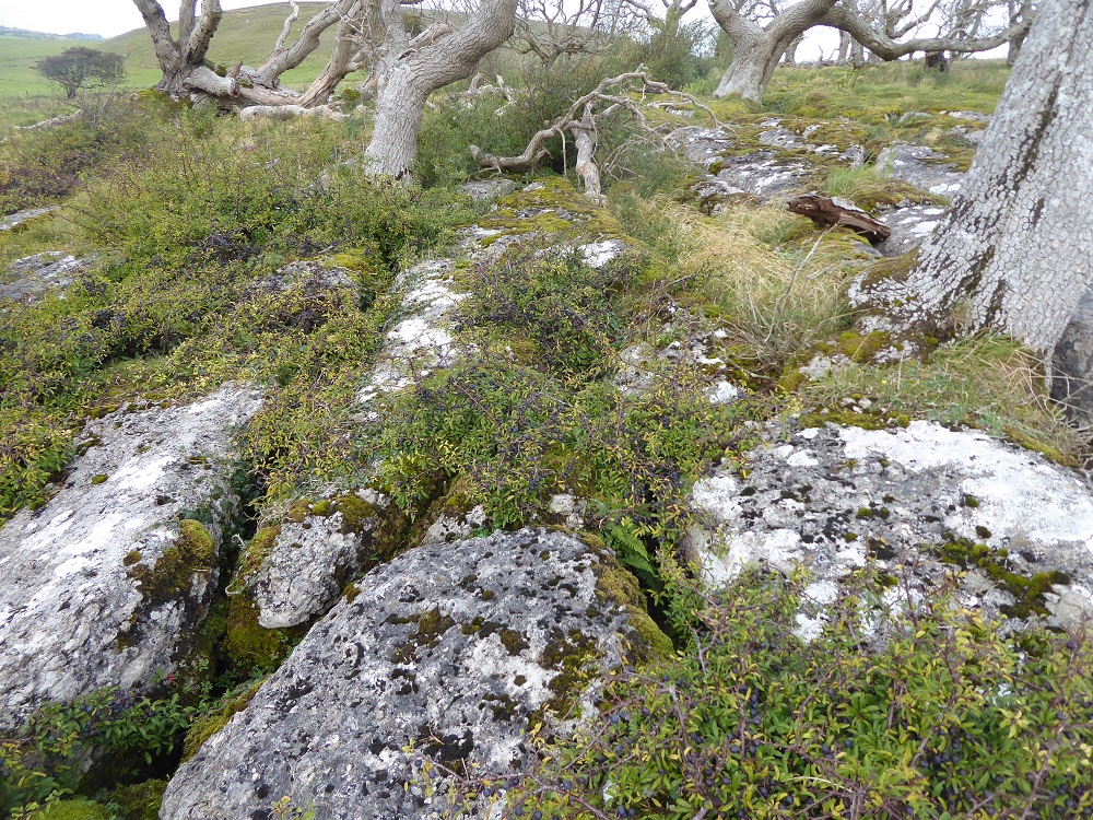 Area 1. To the North and in view of the Solway Firth, are narrow rough clints, only sparsely vegetated, with deep narrow grikes, amongst which sheep and sometimes cattle graze. The trees, predominantly hawthorns, are gnarled and bent, but nevertheless exist. There are interesting lichens on the rocks, with large patches of nearly-white Aspicilia in the light, unshaded areas.