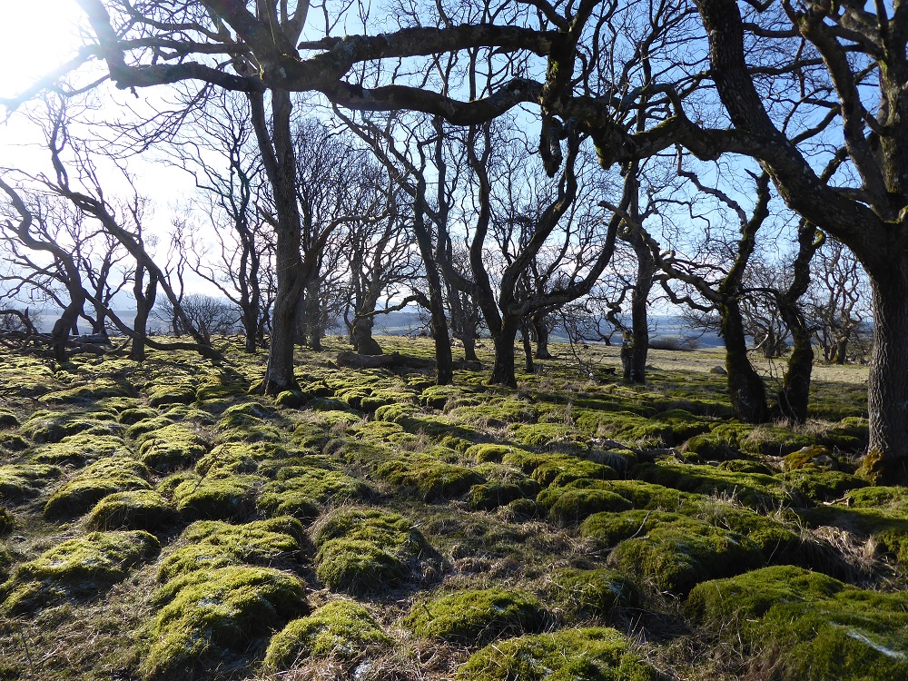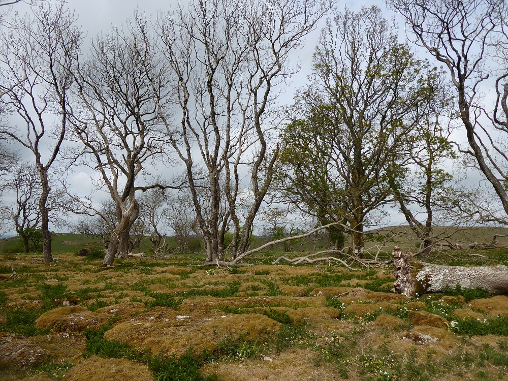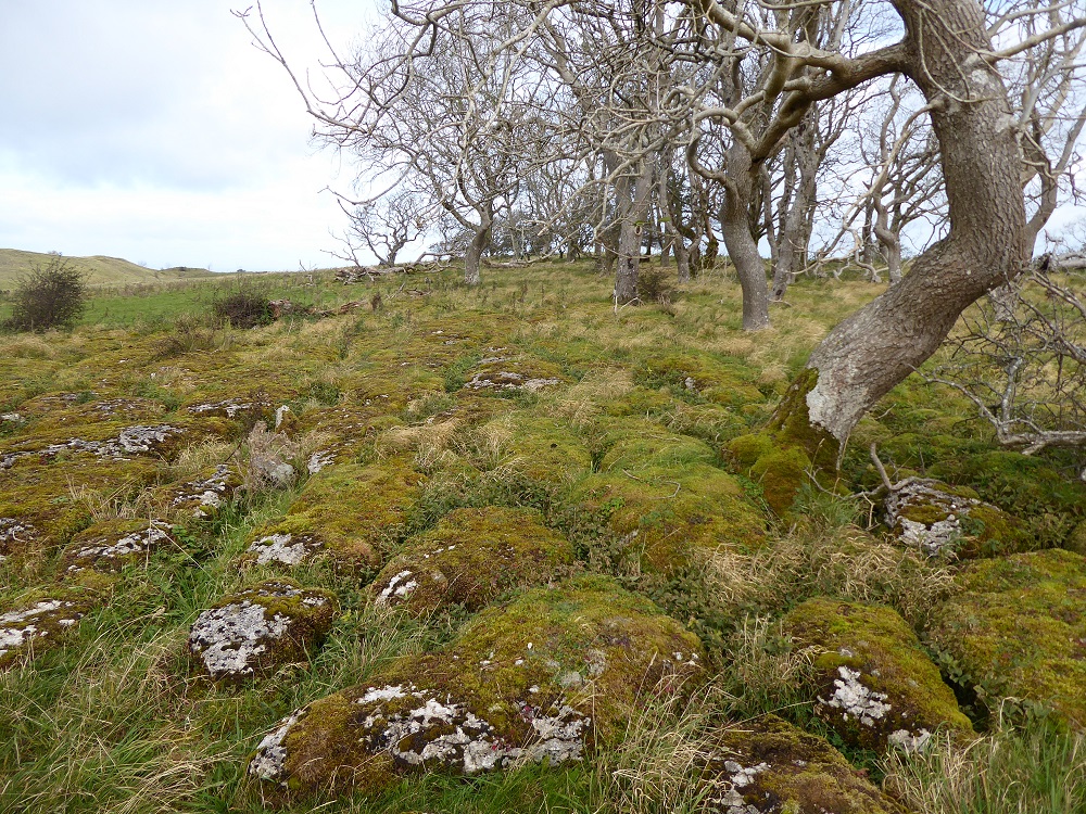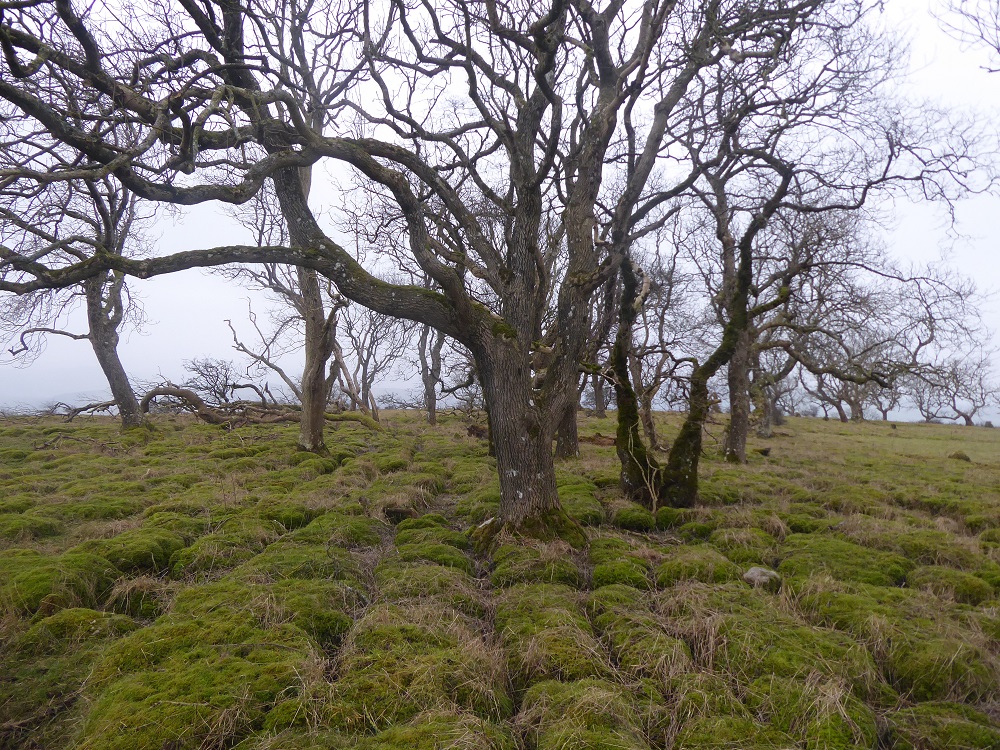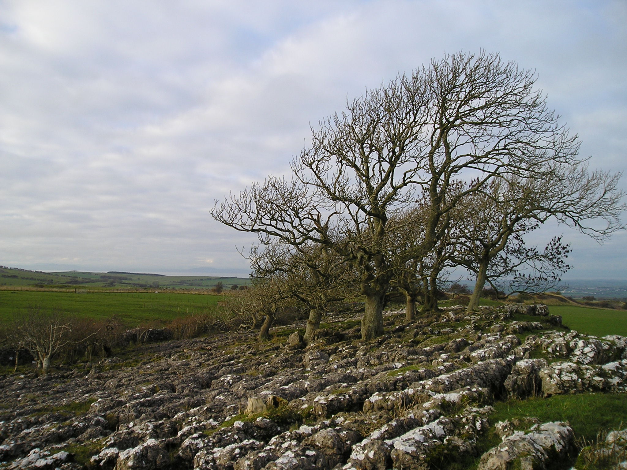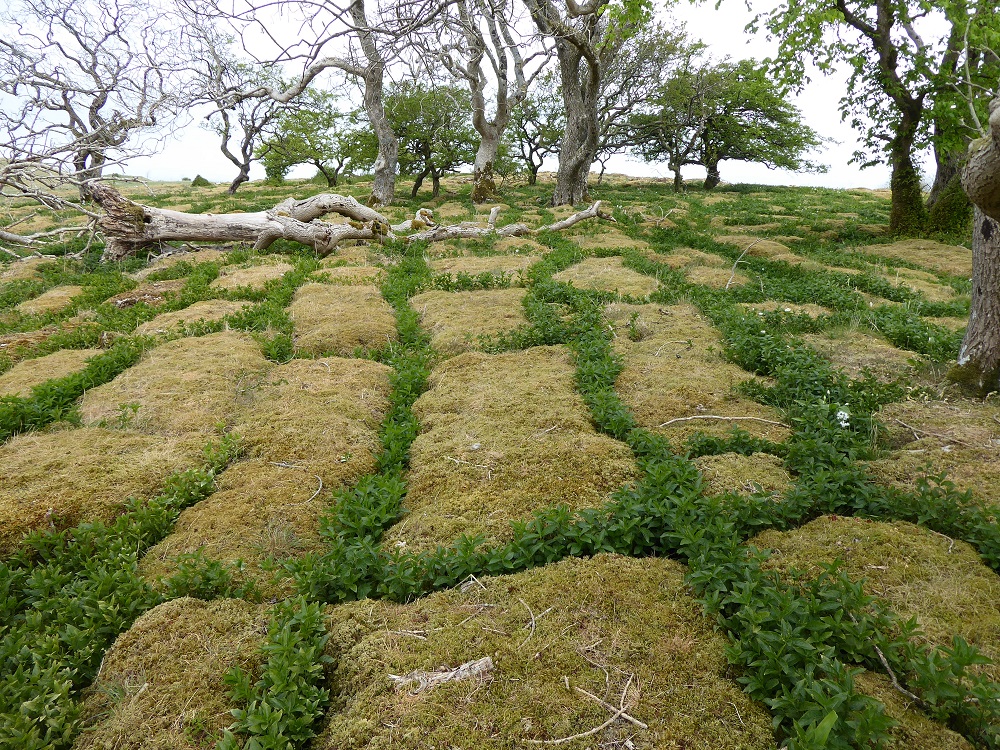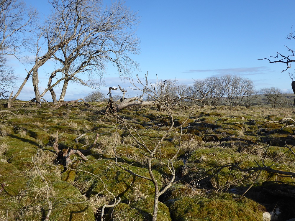 Area 1. To the North and in view of the Solway Firth, are narrow rough clints, only sparsely vegetated, with deep narrow grikes, amongst which sheep and sometimes cattle graze. The trees, predominantly hawthorns, are gnarled and bent, but nevertheless exist. There are interesting lichens on the rocks, with large patches of nearly-white Aspicilia in the light, unshaded areas.
